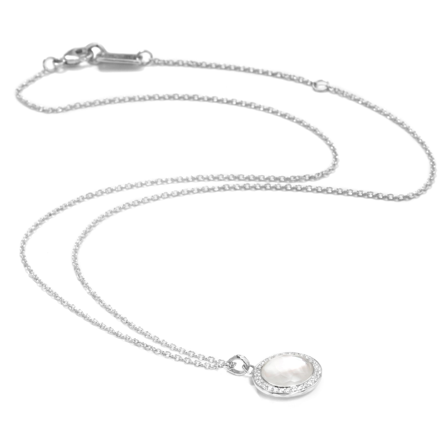 An Ippolita 'Lollipop' mini pendant necklace with a mother of pearl center and a diamond halo. Official Retailer Round mother of pearl Round brilliant cut diamonds=0.14 total carat weight 16" necklace with a 2" extender