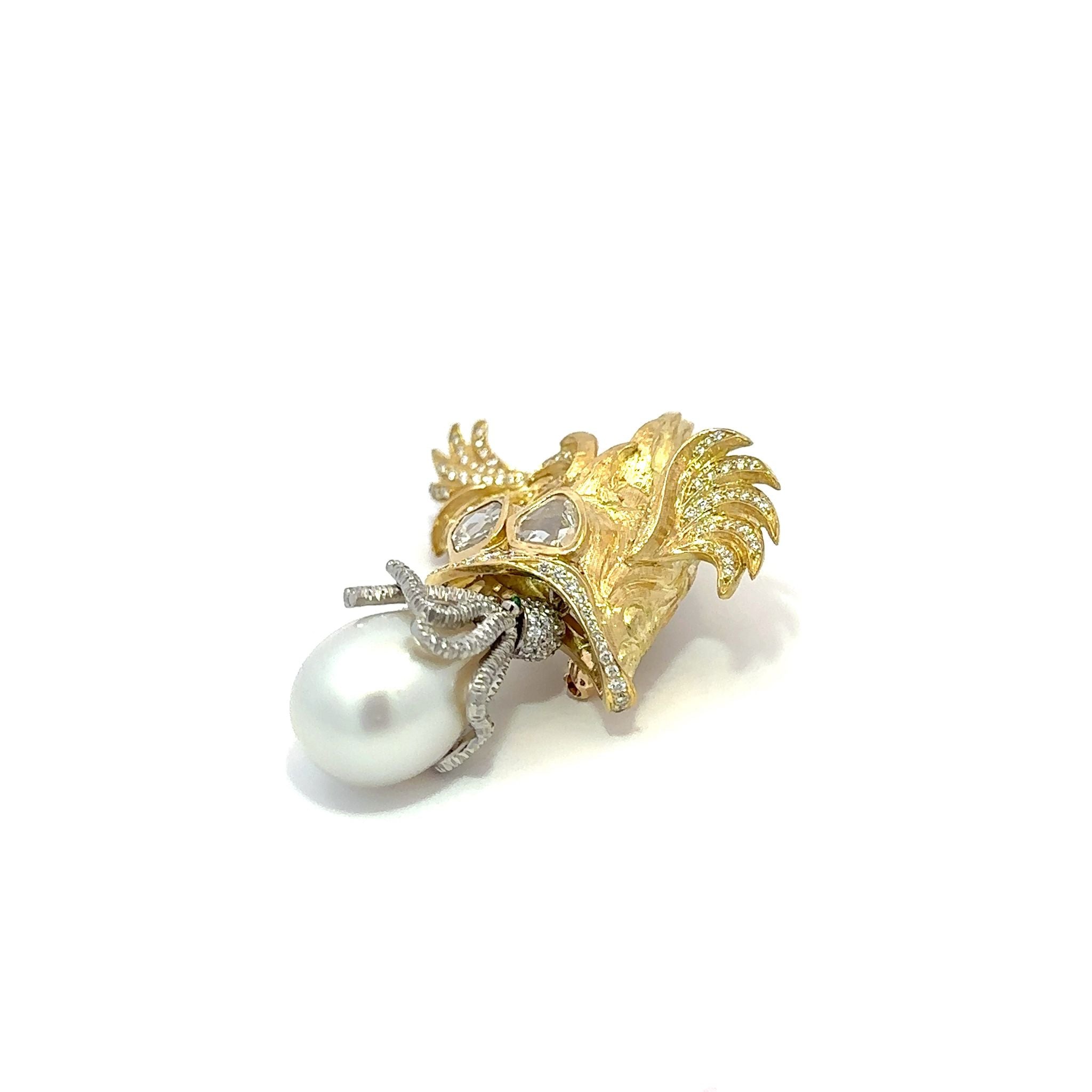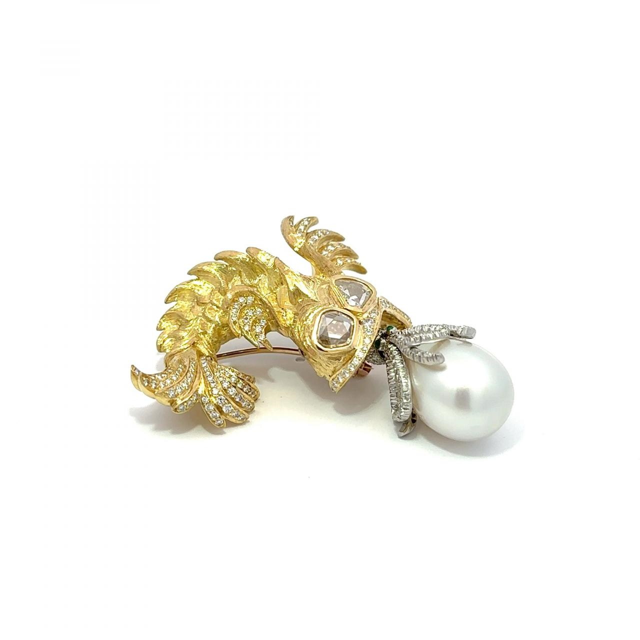 A vintage Julius Cohen figural pin featuring an 18K fish with textured gold scales & bead-set diamond fins & mouth & two angular rose-cut eyes. The fish is gobbling up a platinum octopus with bead-set diamond tentacles & emerald eyes. The octopus is sitting on a South Sea pearl. Circa 1970.