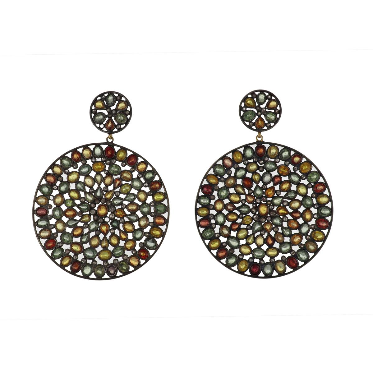 A Maharaja pair of oversized kaleidoscope earrings with (treated) fancy colored sapphires and diamonds, set in sterling silver.