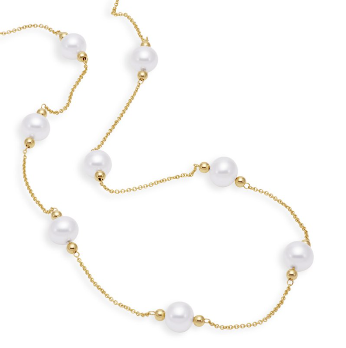 A Mastoloni pearl by the yard necklace, set in 14K yellow gold.