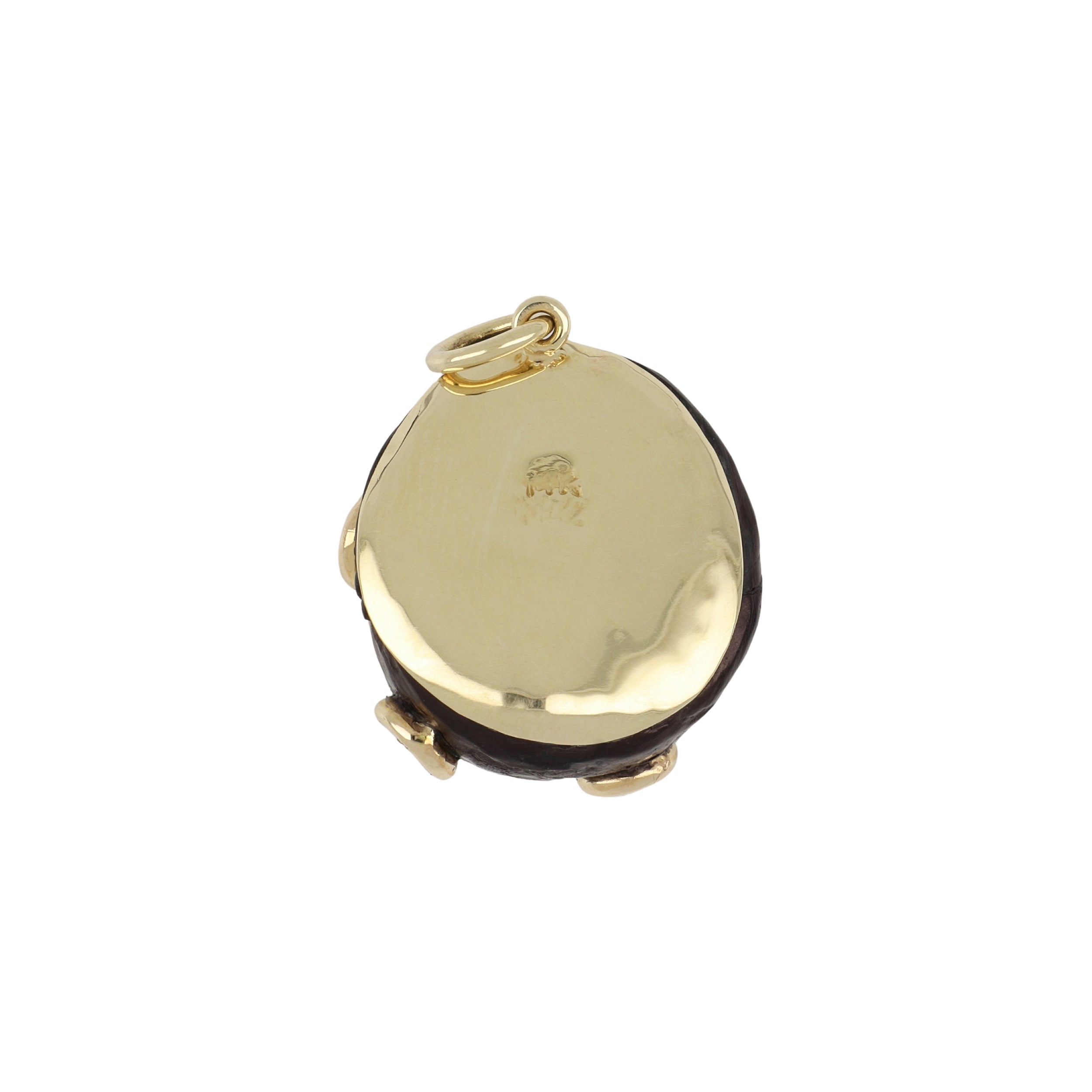 A Mazza black shell charm/pendant with bezel-set pearls, set in 14K yellow gold.