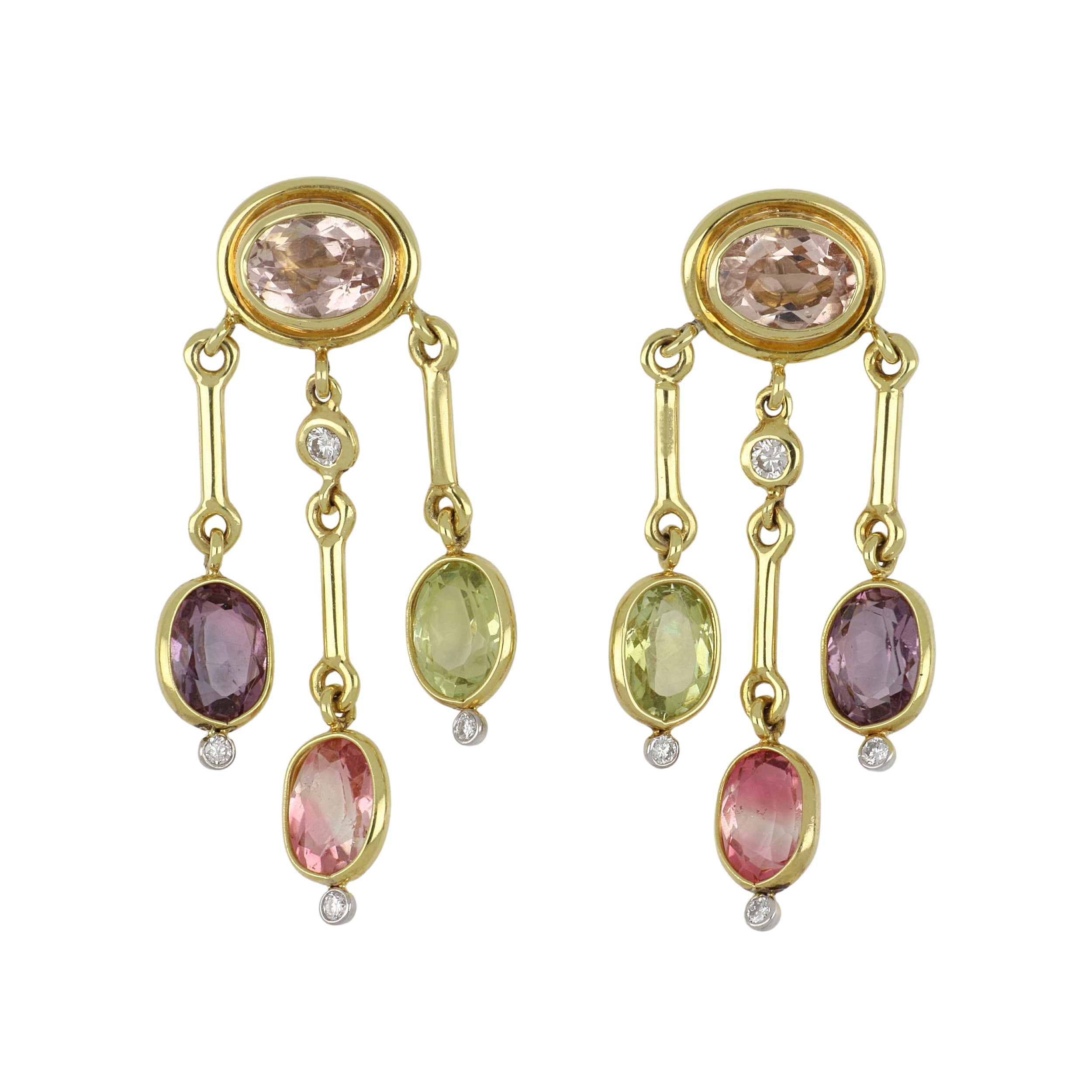 A pair of Mazza multicolored tourmaline fringe drop earrings with round brilliant-cut diamonds, set in 14K yellow gold.