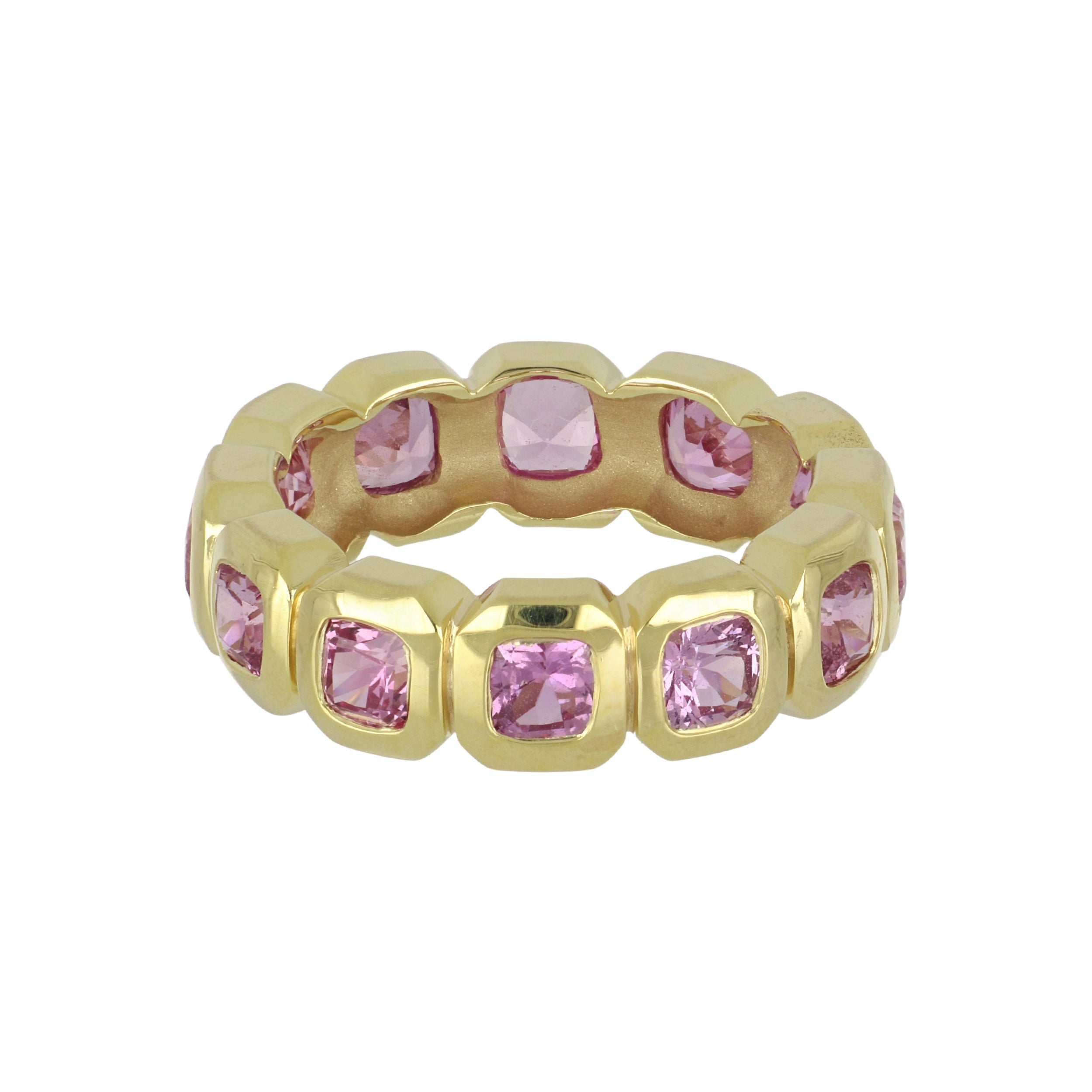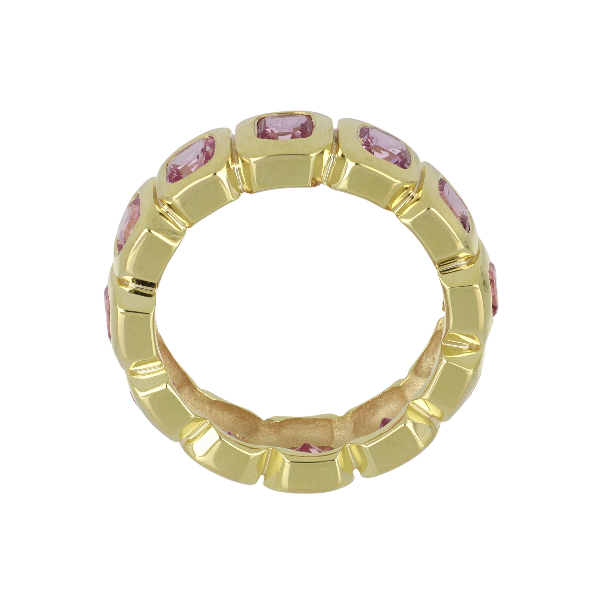 A Mazza 14K yellow gold bezel-set cushion-cut pink sapphire eternity band.