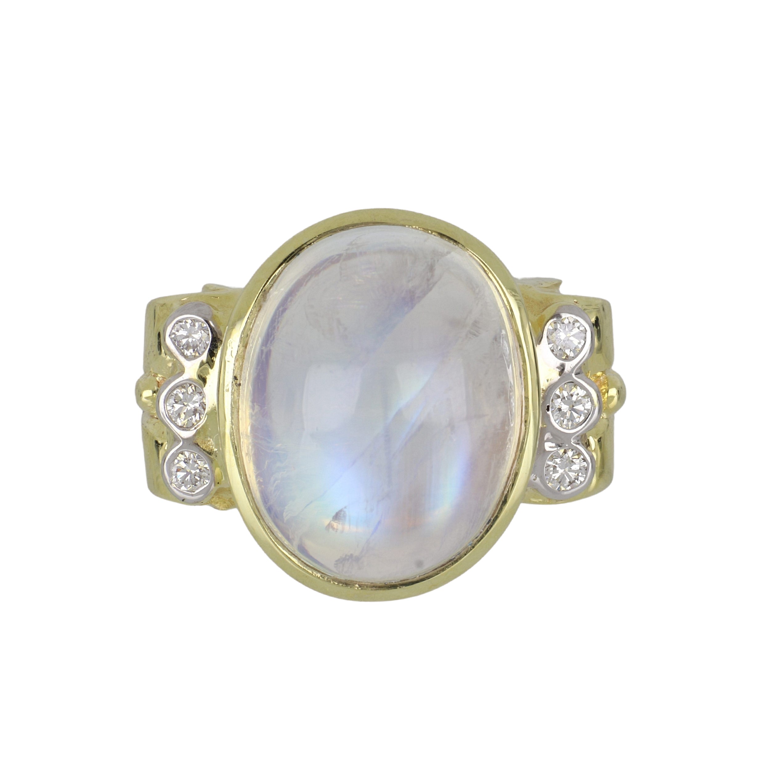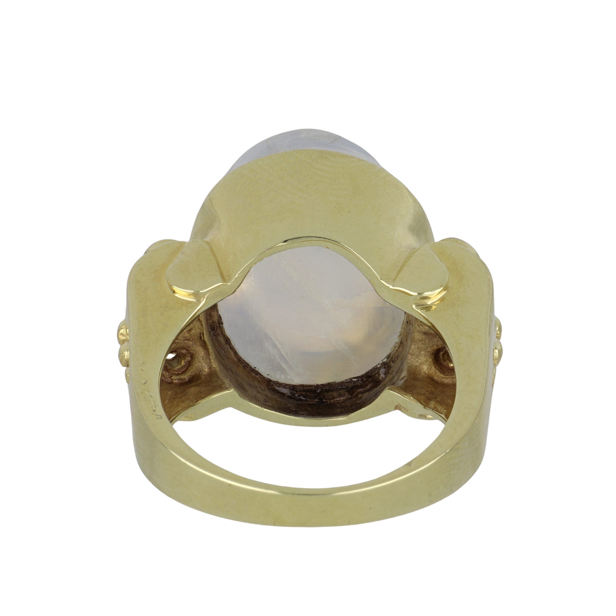 A Mazza cabochon-cut moonstone and round brilliant-cut diamond ring with granulated shank, set in 14k yellow gold.