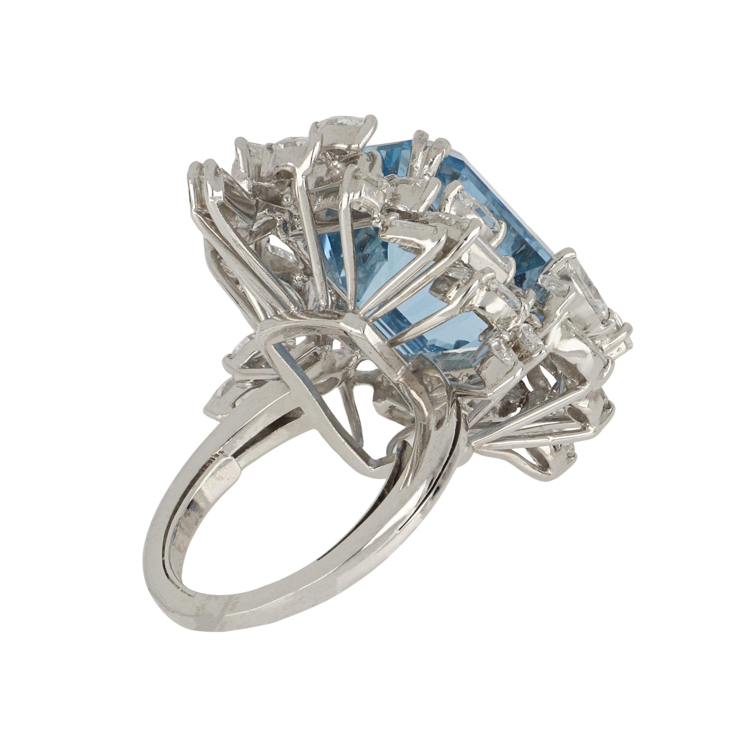 A Mid-Century aquamarine ring with a diamond cluster halo, set in 18K white gold. Circa 1960