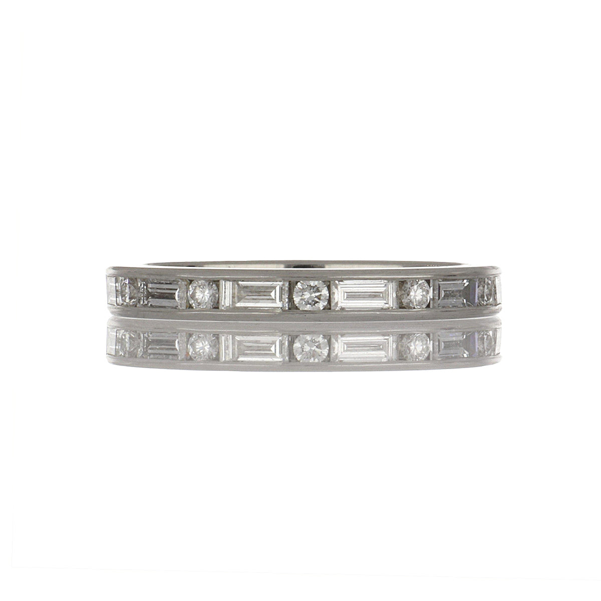 A platinum diamond eternity band with alternating round and baguette-cut diamonds.