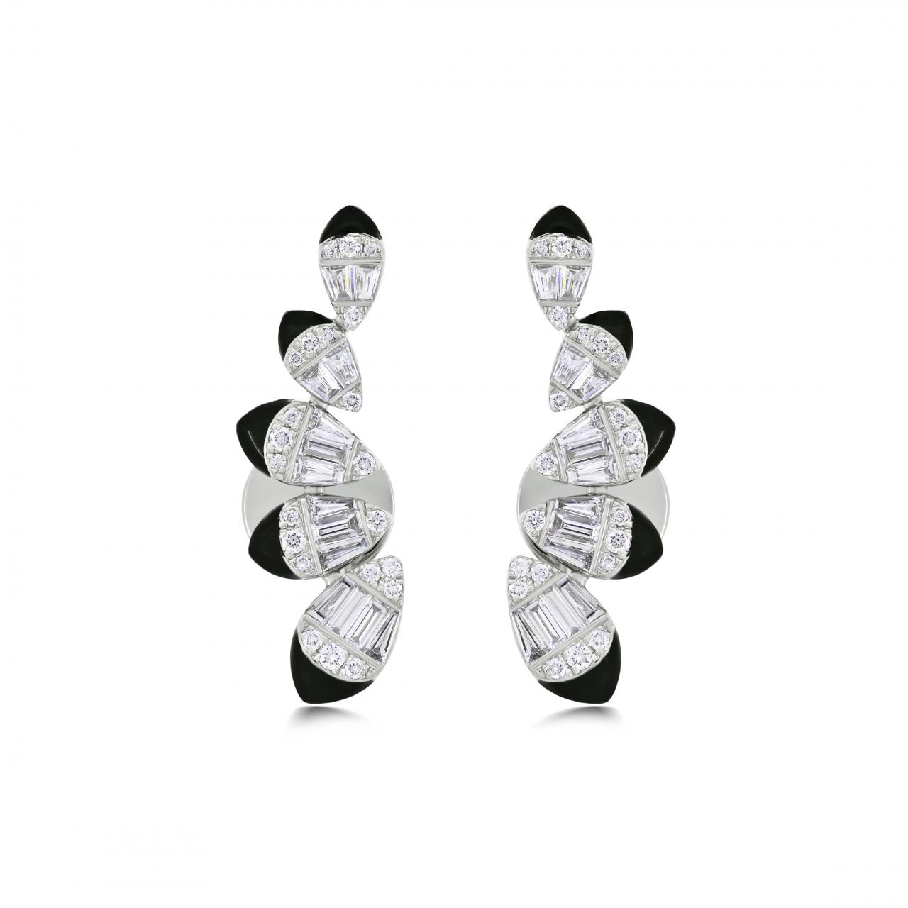 A new pair of enameled, baguette and round brilliant-cut diamond earrings in 18k white gold.