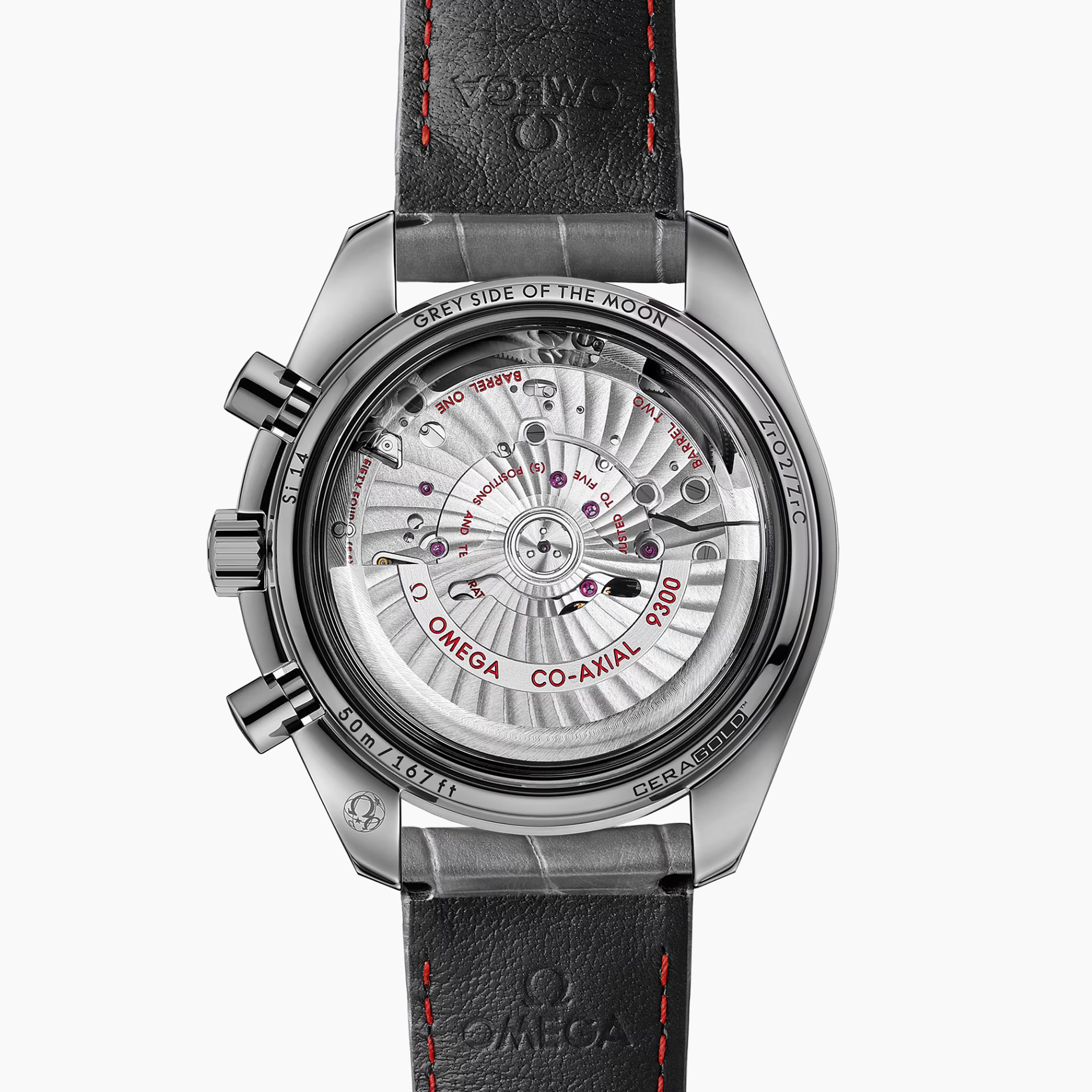 Reminiscent of its legendary predecessors, the Speedmaster Grey Side of the Moon "Meteorite" has a 60-minute and 12-hour recorder at 3 o’clock and a small seconds sub-dial at 9 o’clock. OMEGA’s Co-Axial calibre 9300 can be seen through the bevelled sapphire crystal caseback.