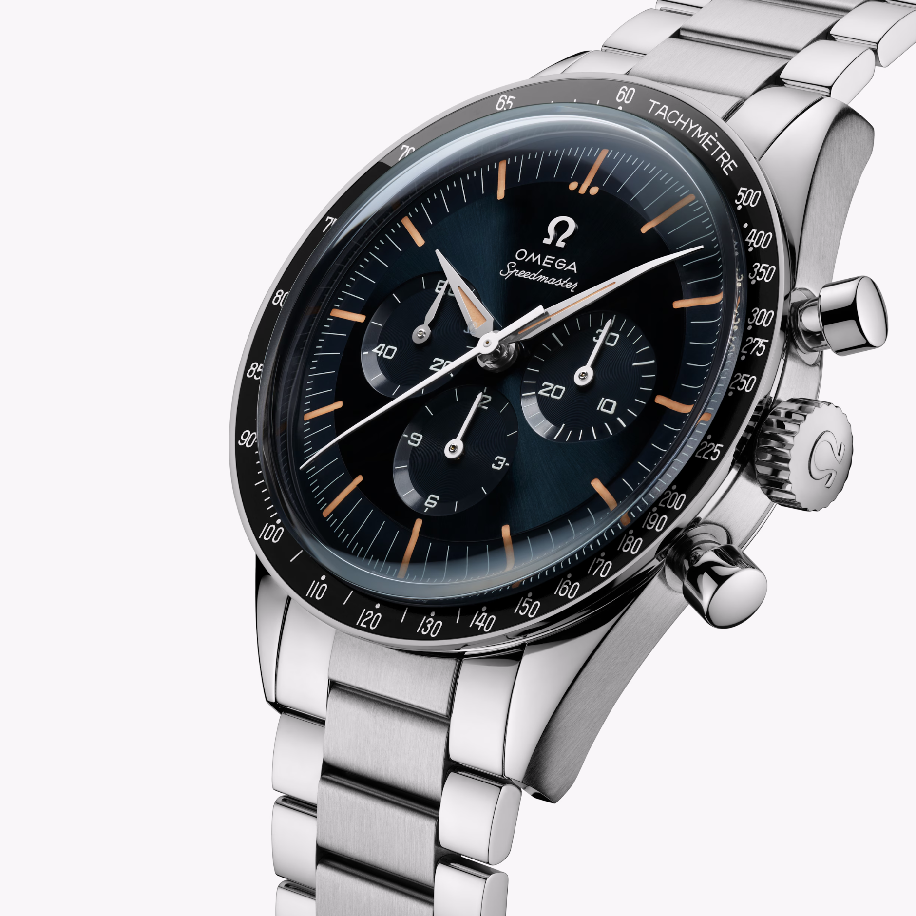 The 39.70 mm case is crafted in polished and brushed stainless steel and features a “flat links” bracelet with OMEGA’s patented comfort release adjustment system. The bezel ring is presented in black aluminium and includes the legendary tachymeter scale with an emblematic “Dot Over Ninety”.