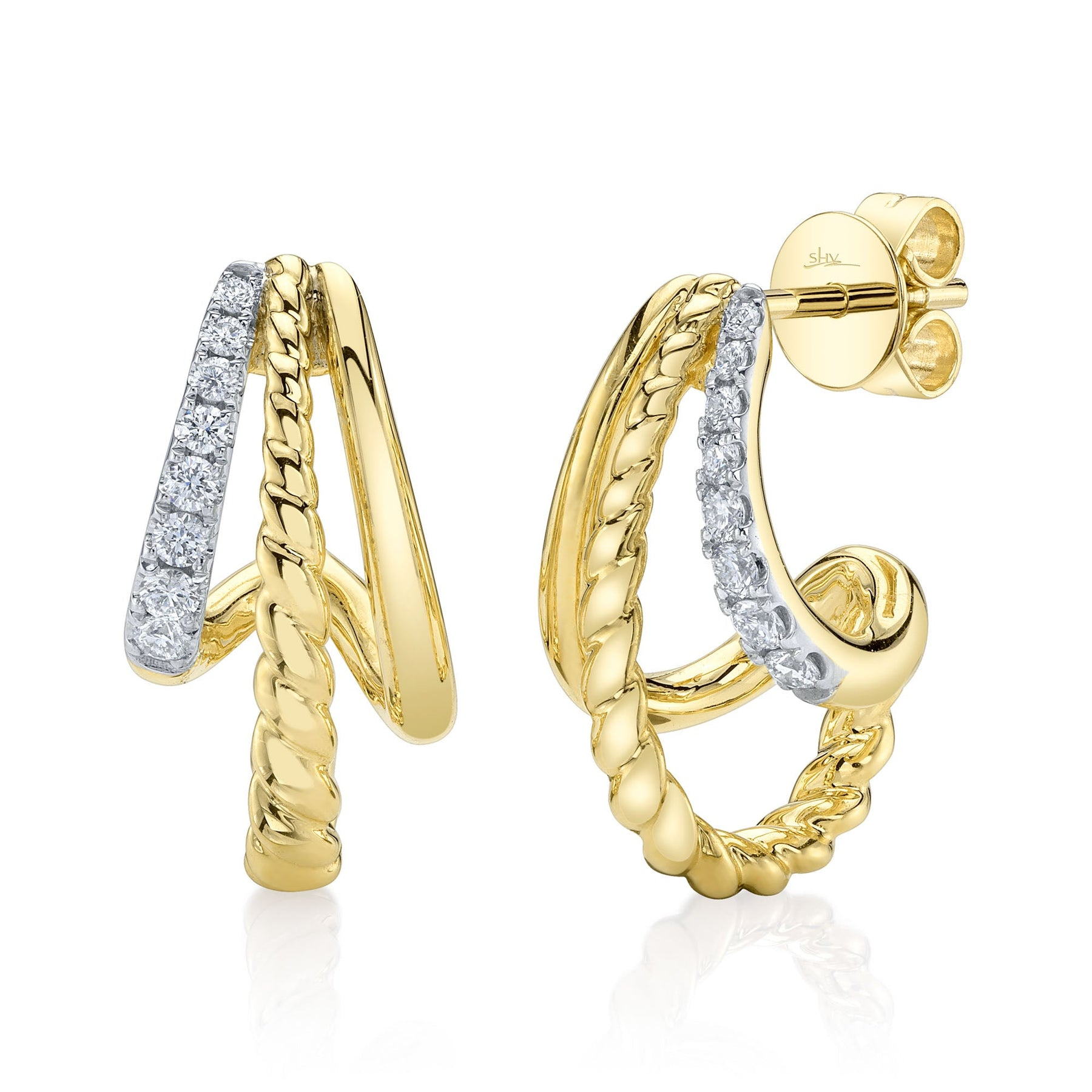 A pair of Shy Creation round-cut diamond twisted half hoop earrings from the Kate collection, set in 14K yellow gold.