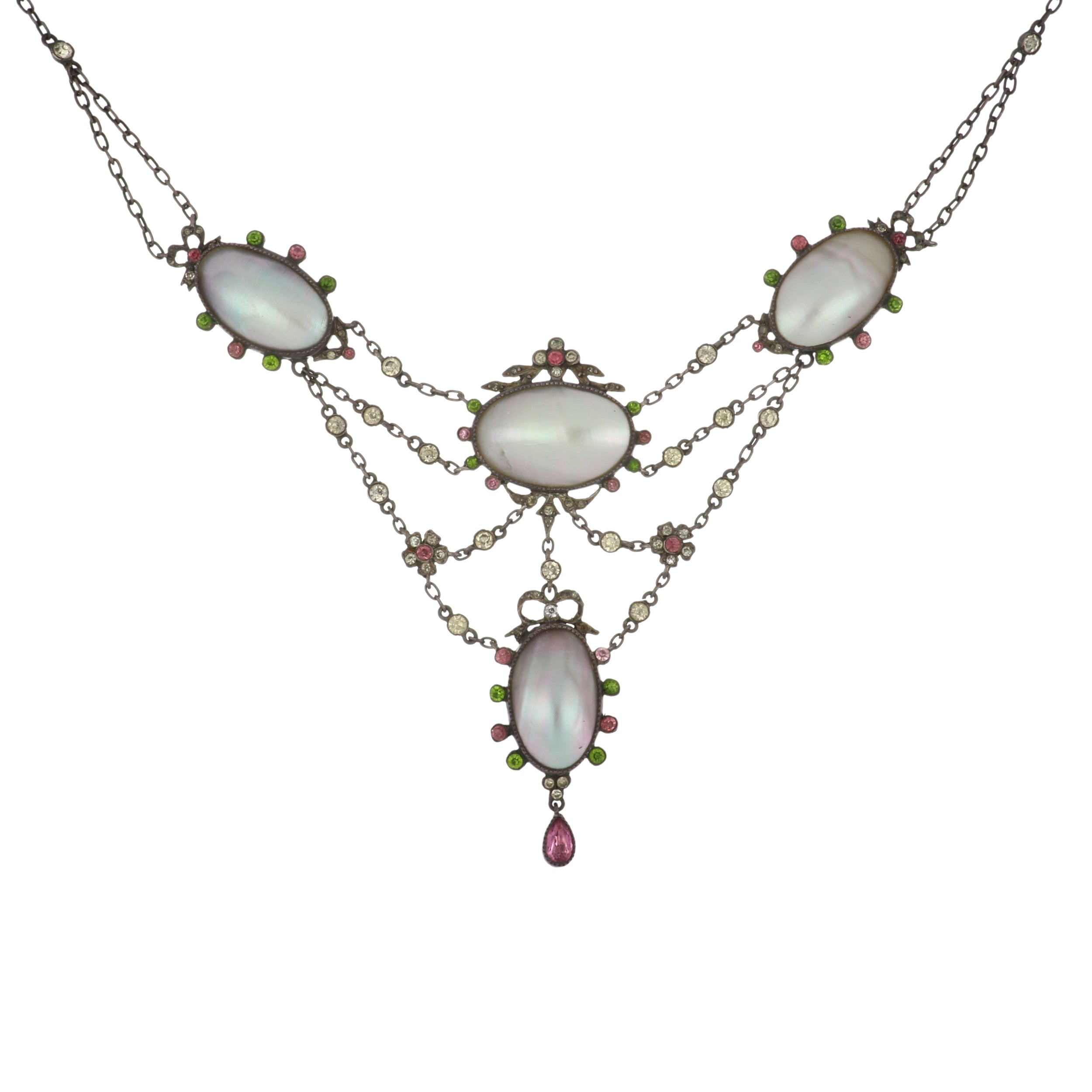 An Edwardian silver multicolored paste and coque de perle festoon suffragette necklace, with french hallmarks and fitted box, Circa 1900