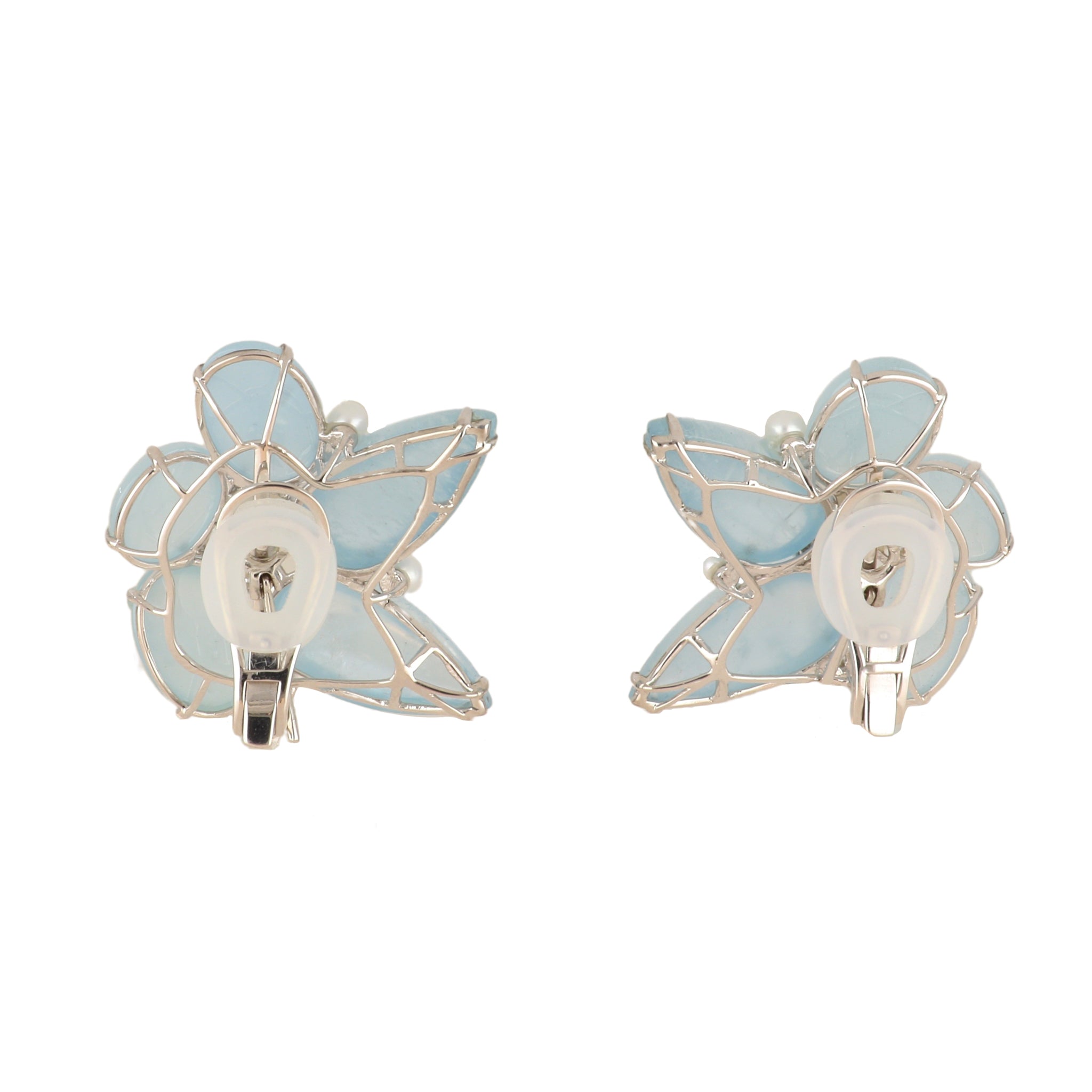 A pair of cabochon-cut aquamarine, pearl and round brilliant-cut diamond clip earrings, set in 18k white gold.