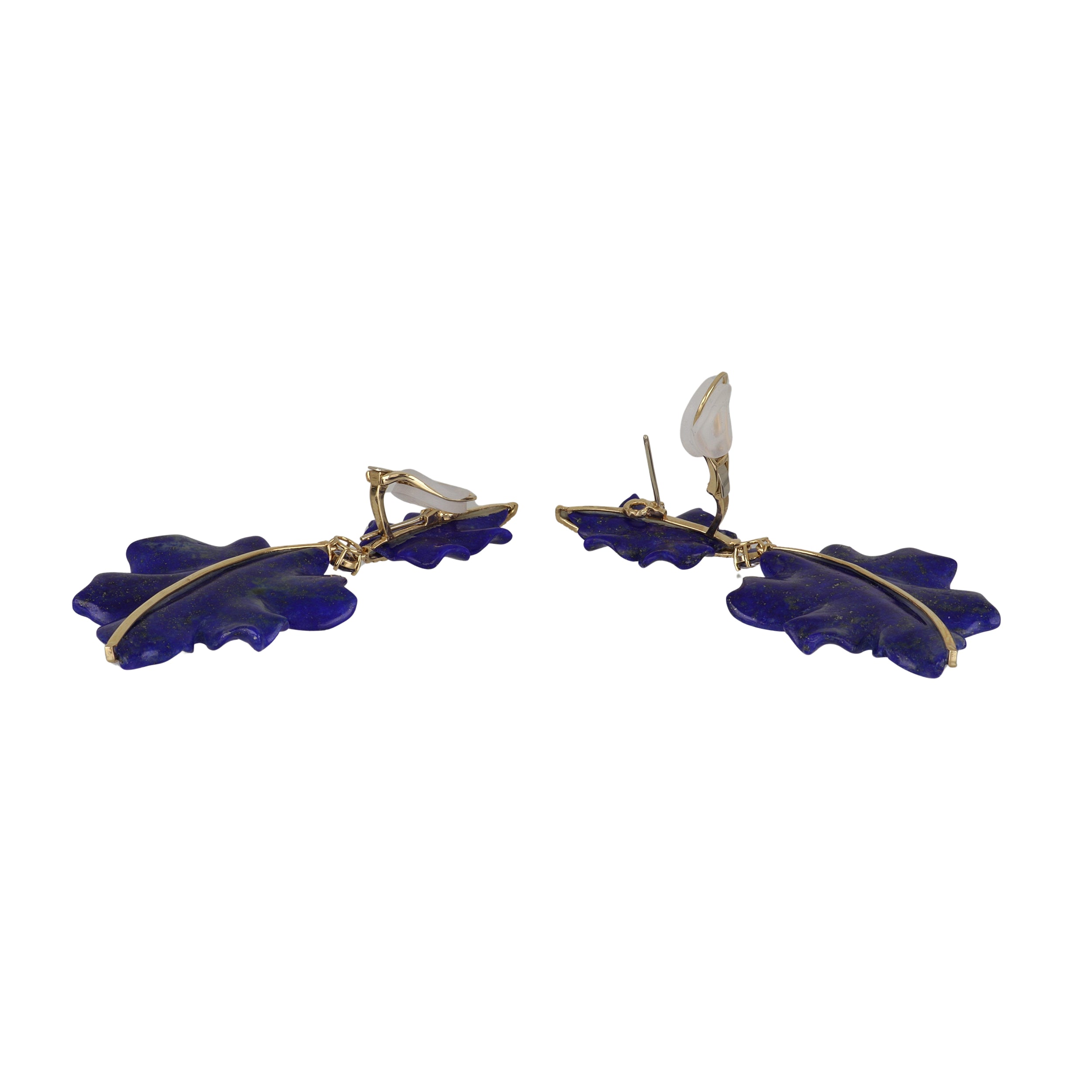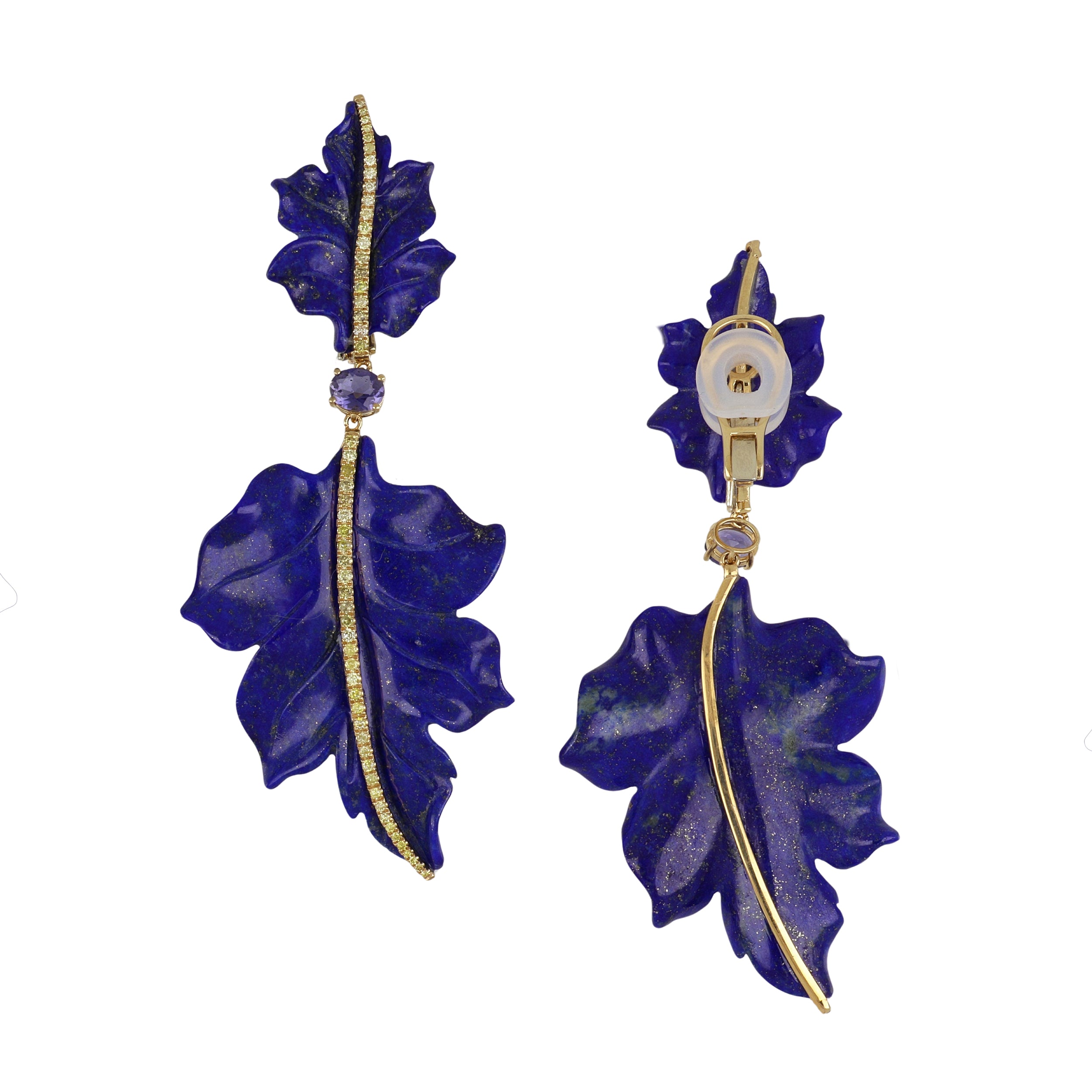 A pair of carved lapis lazuli leaf earrings with iolite and yellow diamond accents, set in 18K yellow gold.