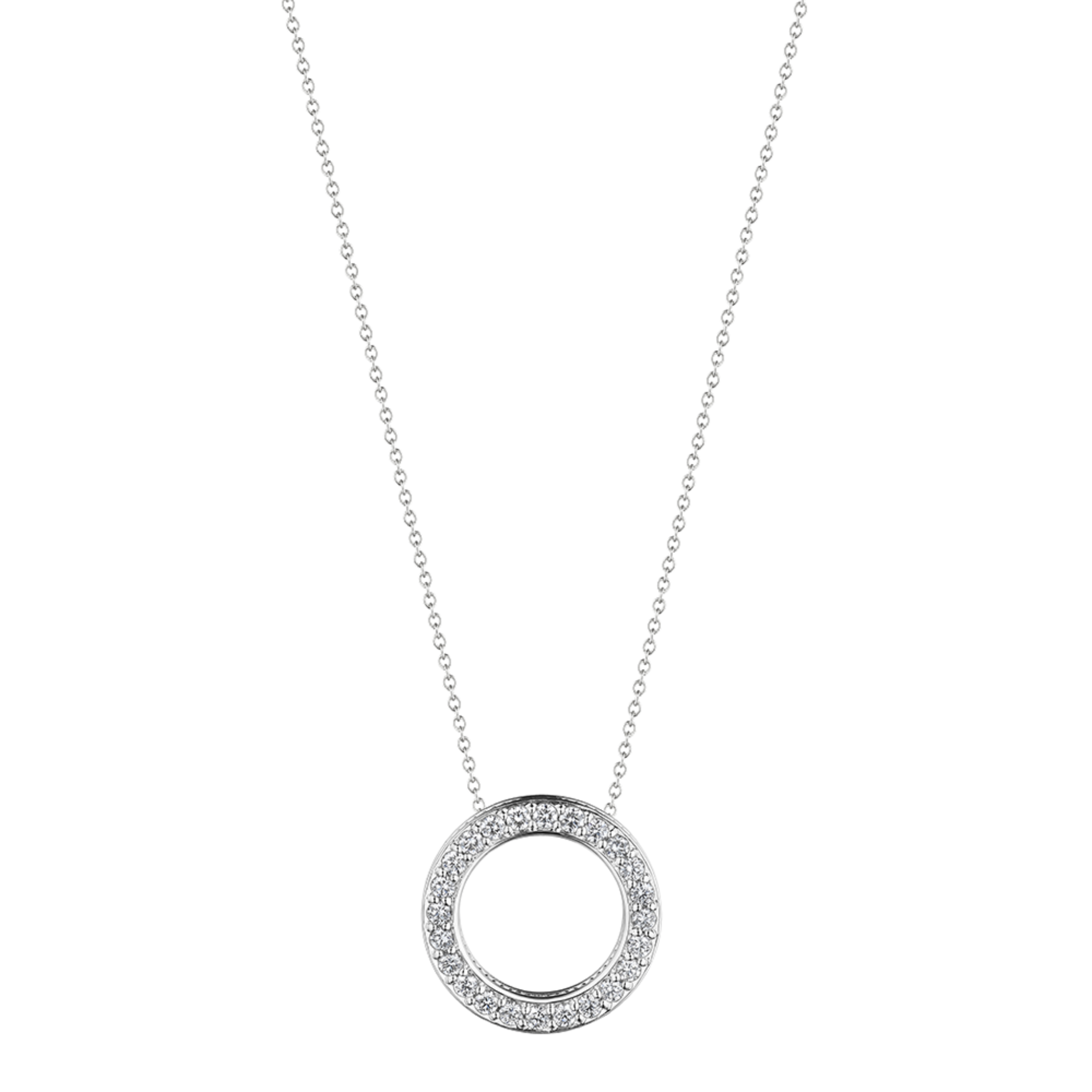 A Verragio Veritage collection 18K white gold beaded diamond circle pendant necklace.
