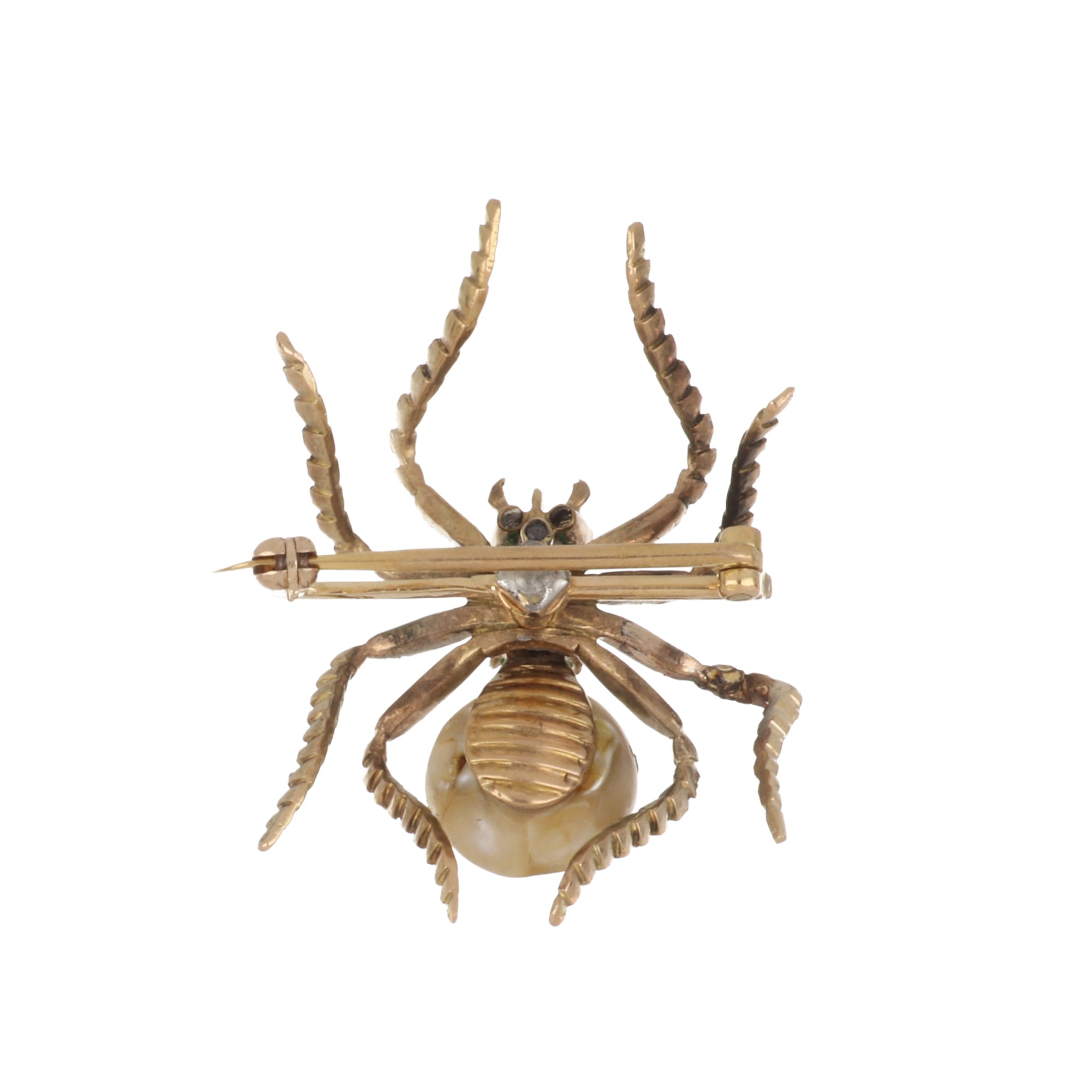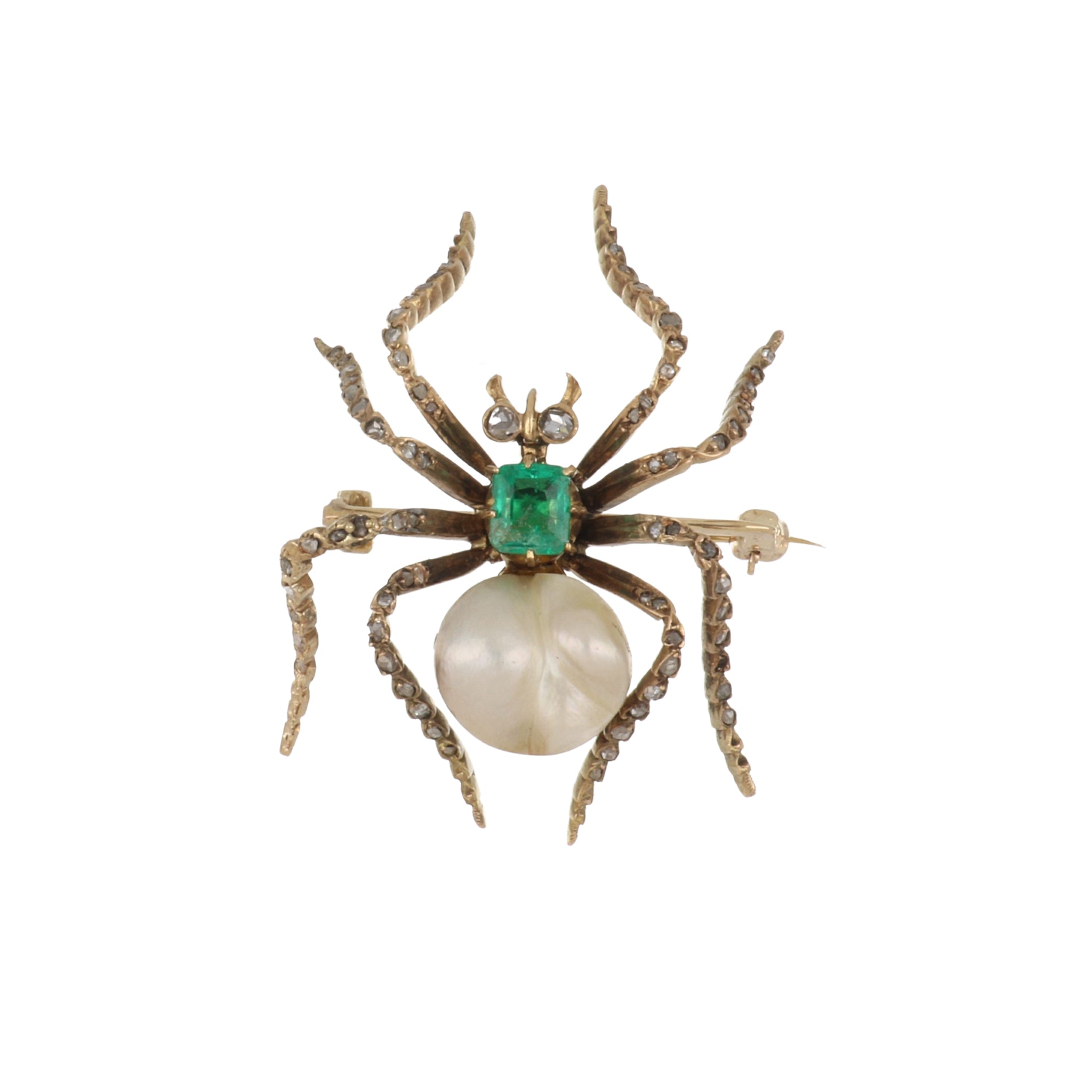 A Victorian rose-cut diamond spider pin with a single rectangular shape emerald and natural pearl abdomen in 14k yellow gold. Circa 1860.