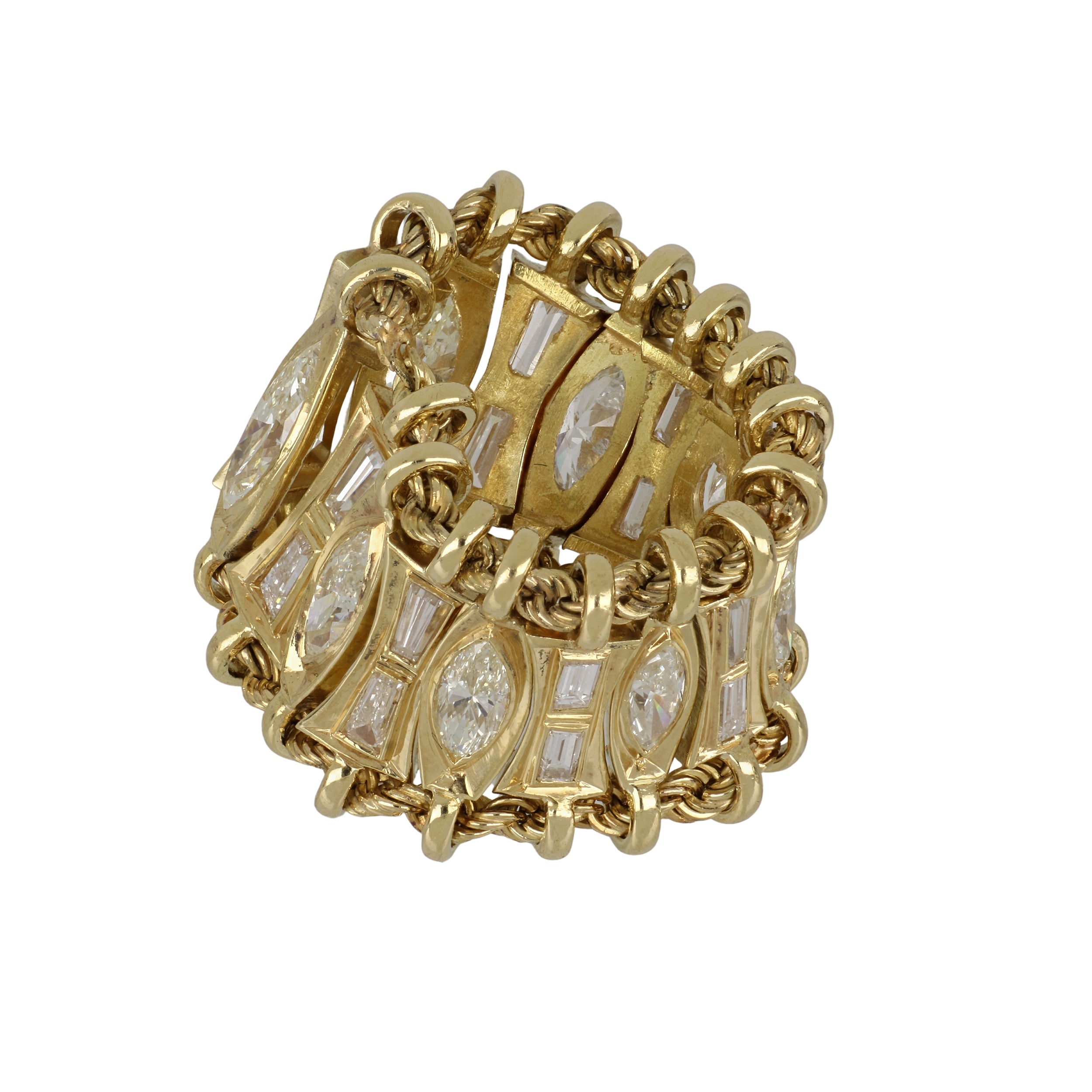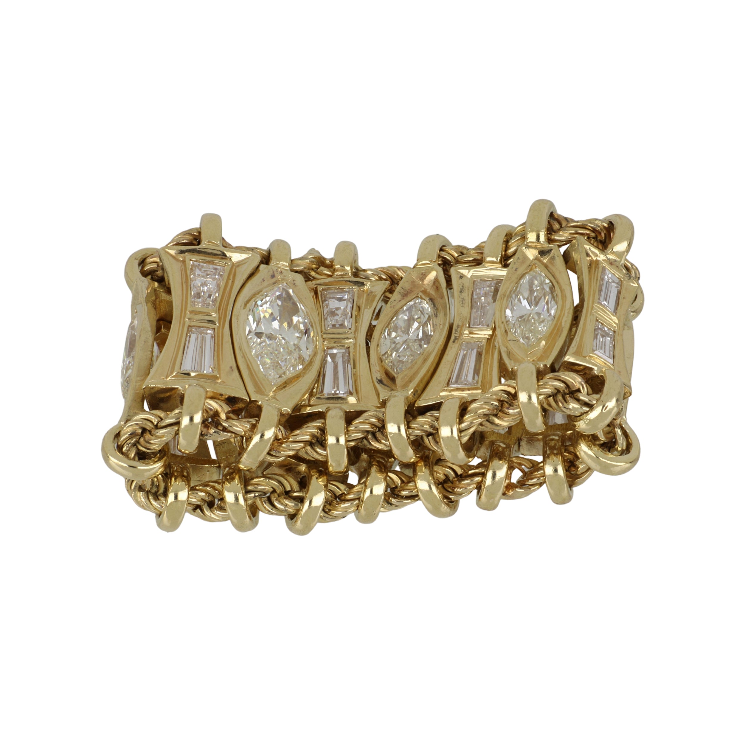 A vintage chain link band featuring marquise and baguette-cut diamonds, in 18K yellow gold. Circa 1980.