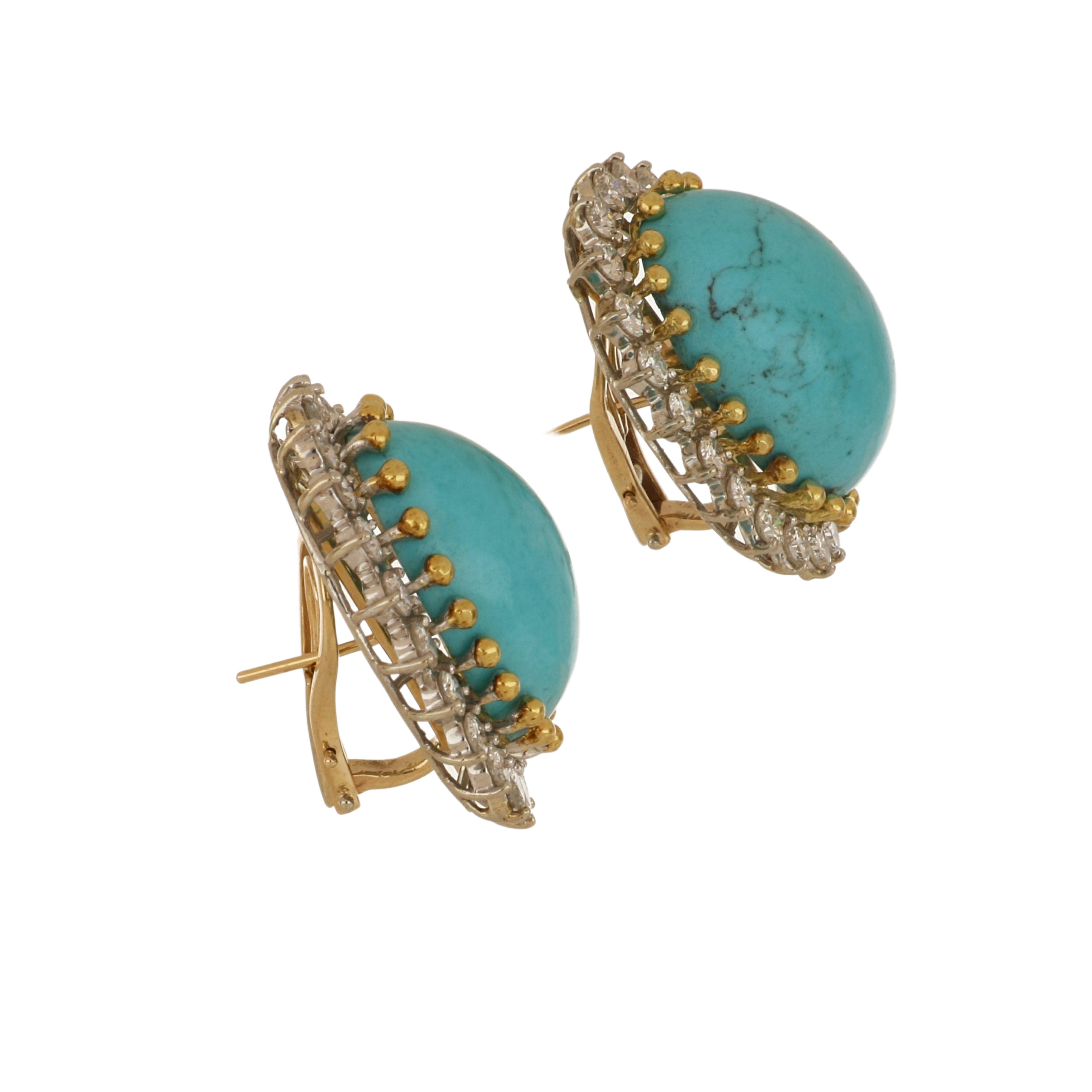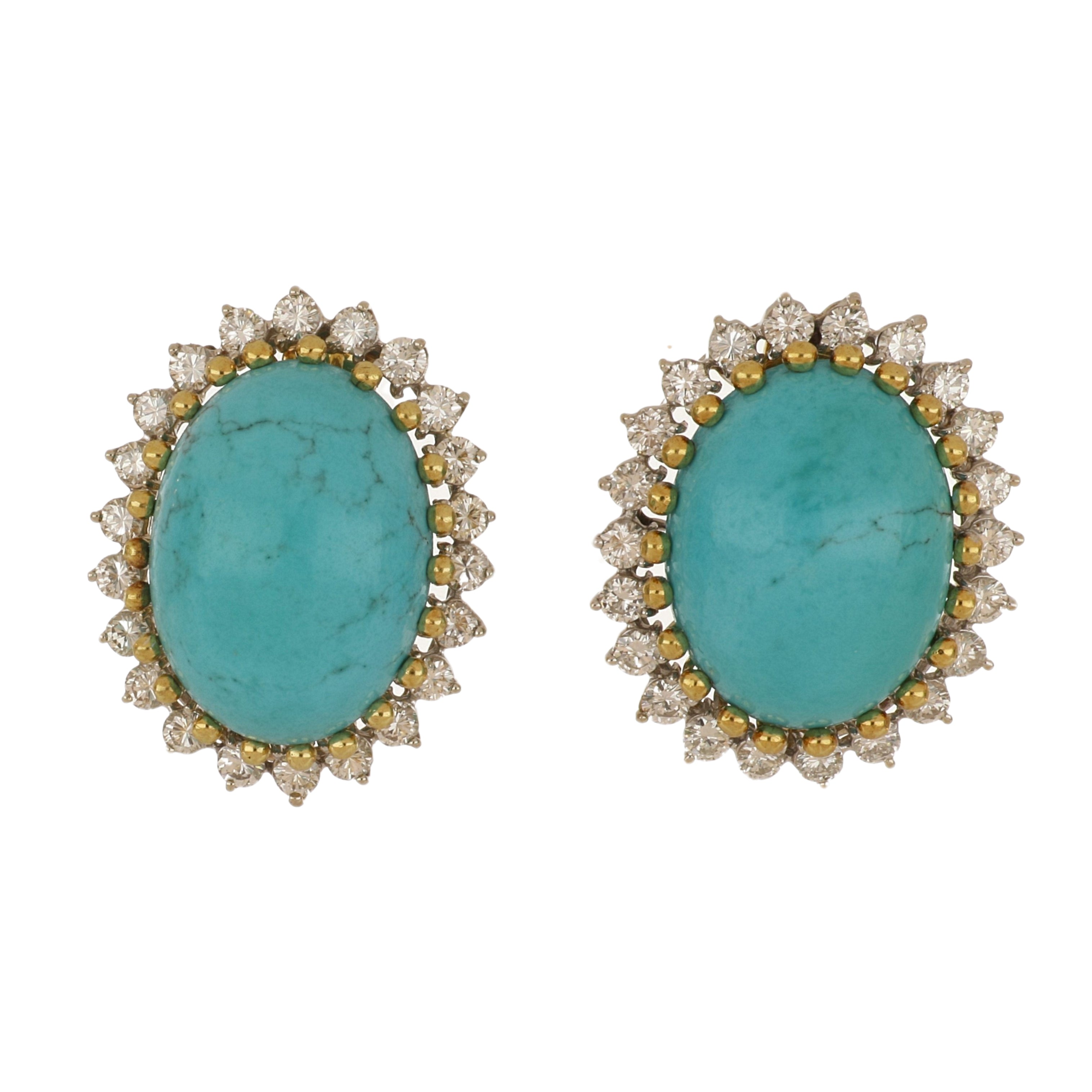 A pair of vintage oval cabochon-cut turquoise clip earrings with prong-set round brilliant-cut diamond borders set in 14K yellow and white gold. Circa 1980.
