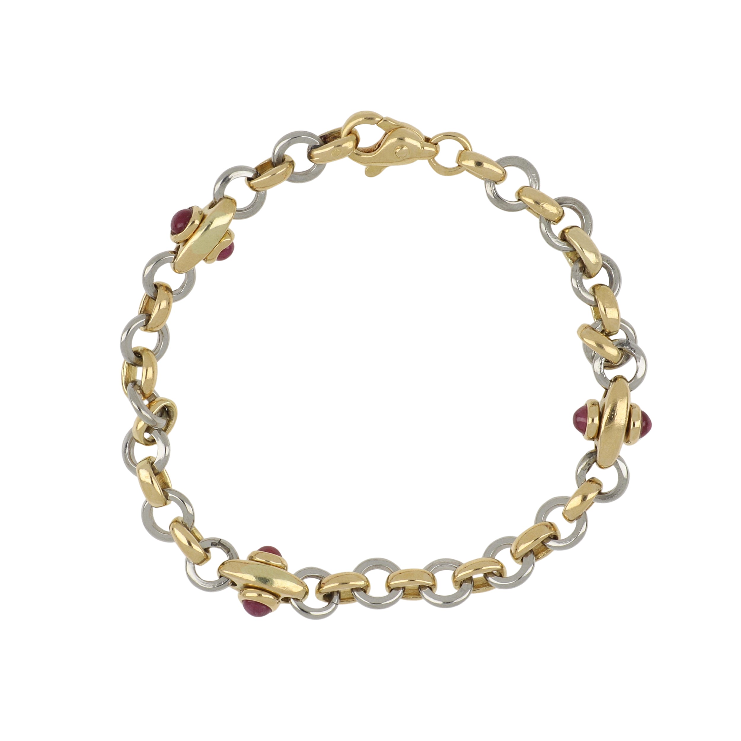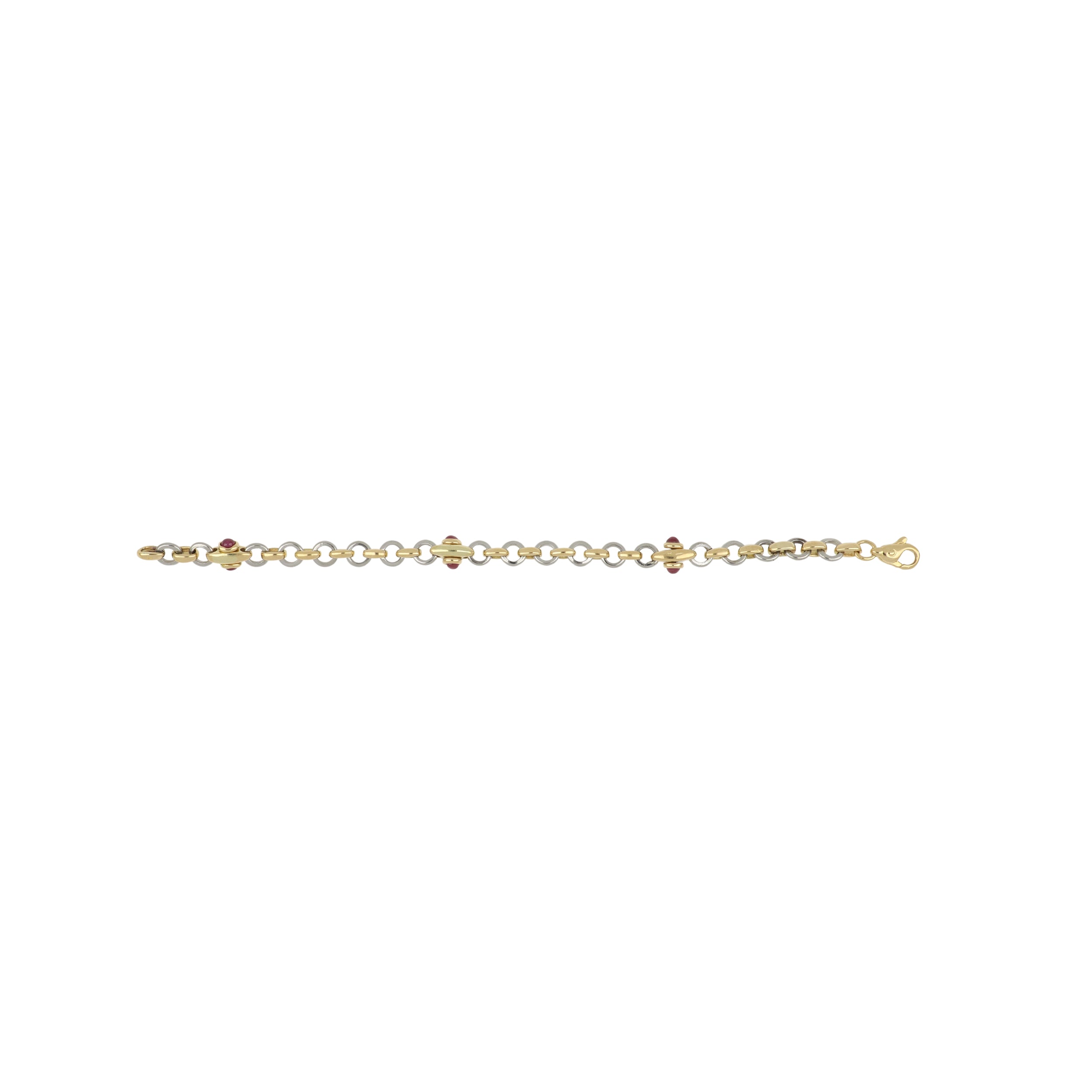 A vintage cabochon cut ruby station bracelet, set in 18K yellow gold and sterling silver. Circa 1990.