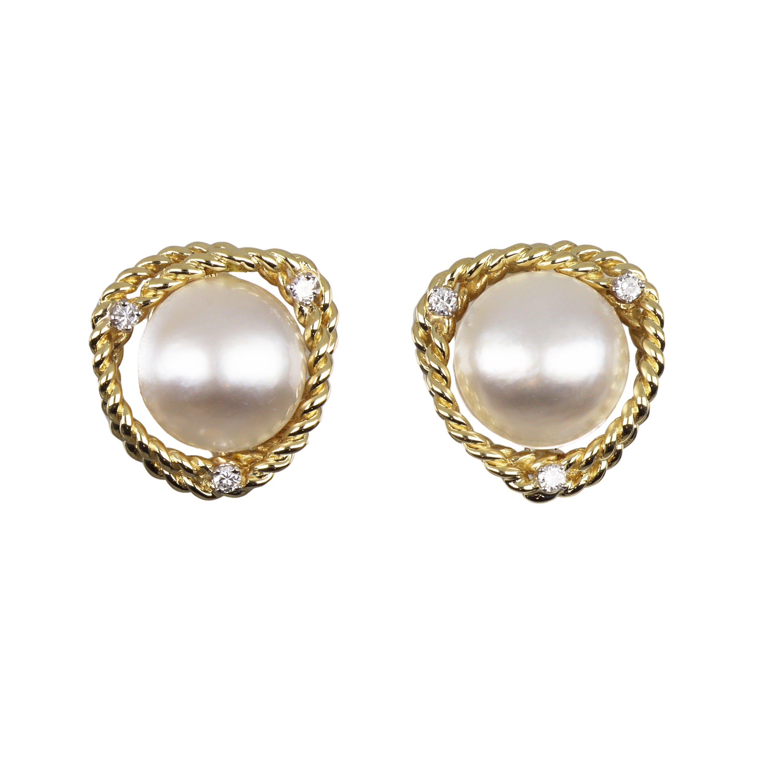 Vintage 1990s 18K Gold Mabe Pearl Earrings with Diamonds
