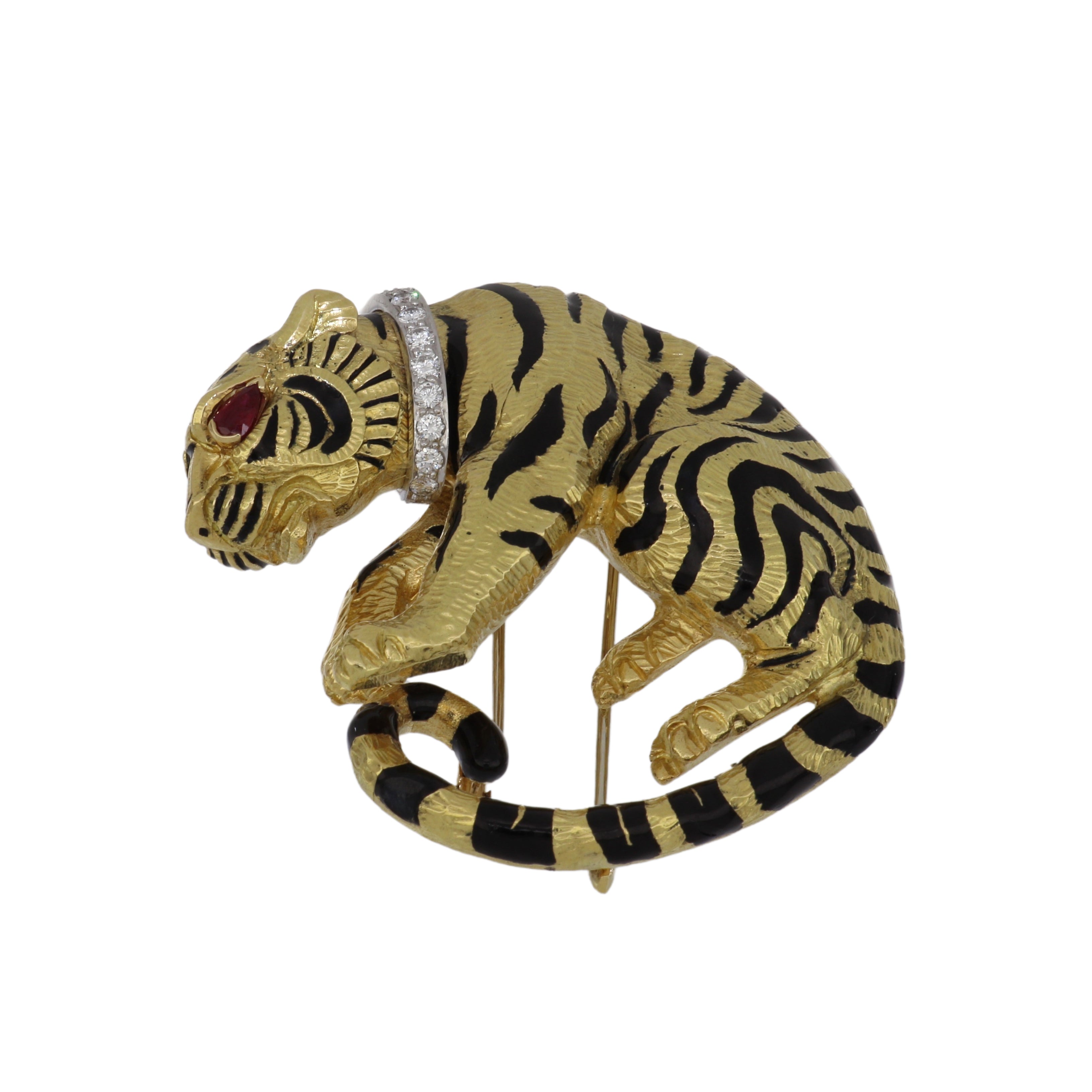A vintage David Webb black enamel tiger brooch with a ruby eye and diamond collar, set in 18K yellow gold. From the Kingdom Collection.