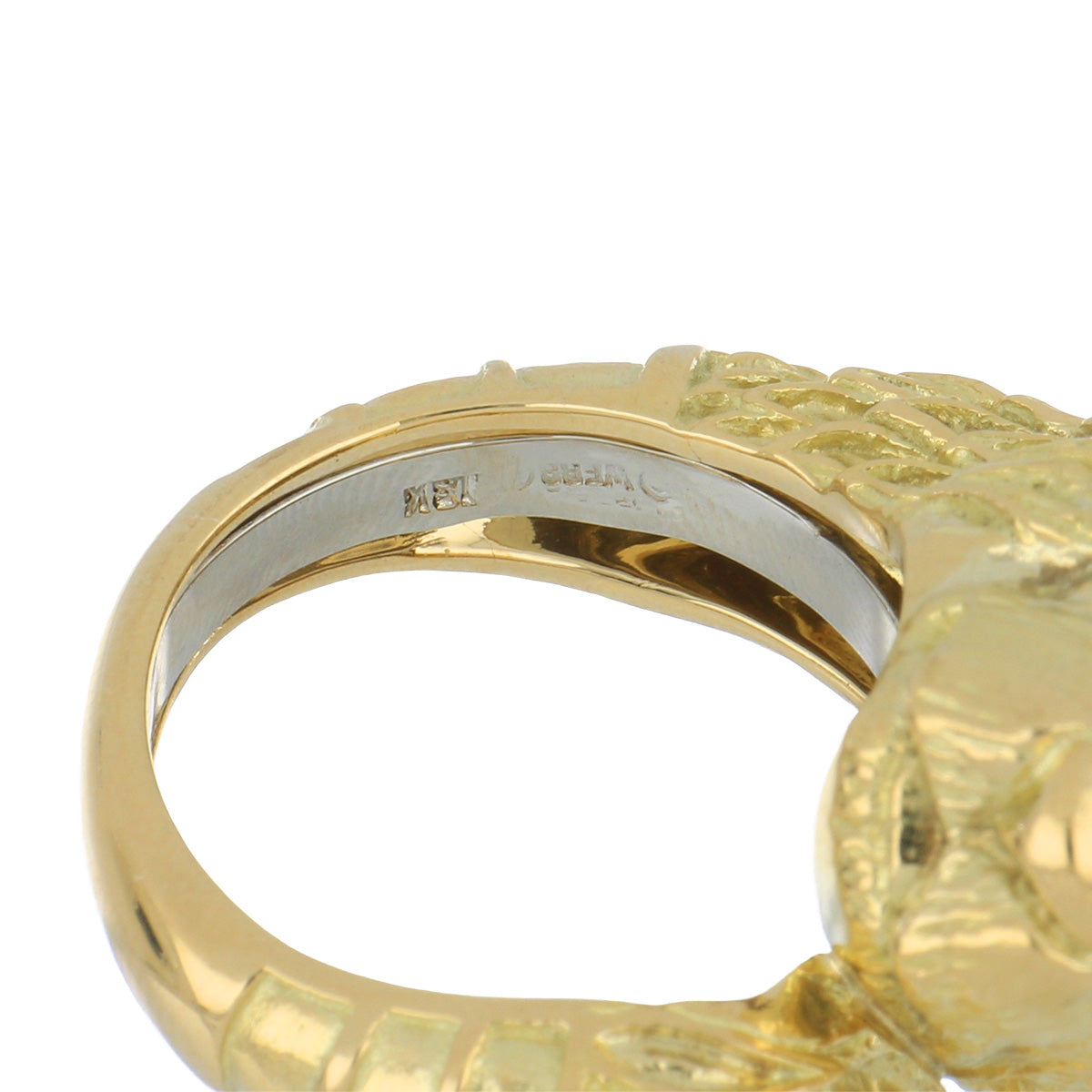 A vintage David Webb lion ring with bezel-set emerald eyes, in 18K yellow gold. From the Kingdom Collection. Circa 1990.Vintage & Estate Collection2 cabochon-cut emeralds: 0.10 total carat weight