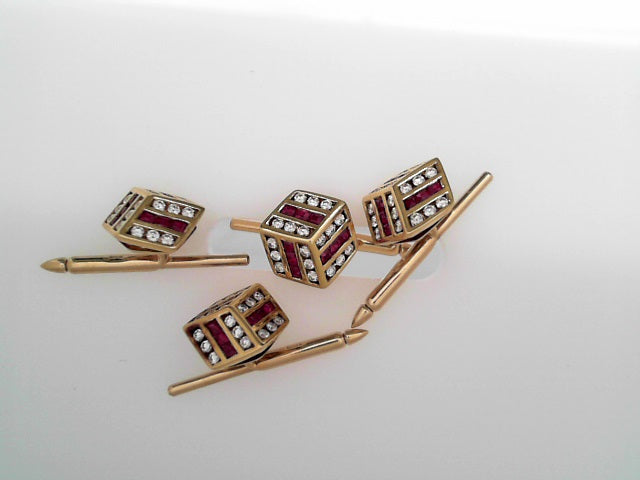 A set of estate vintage channel set baguette-cut ruby and round diamond "dice" cufflinks and stud set, in 18k yellow gold.