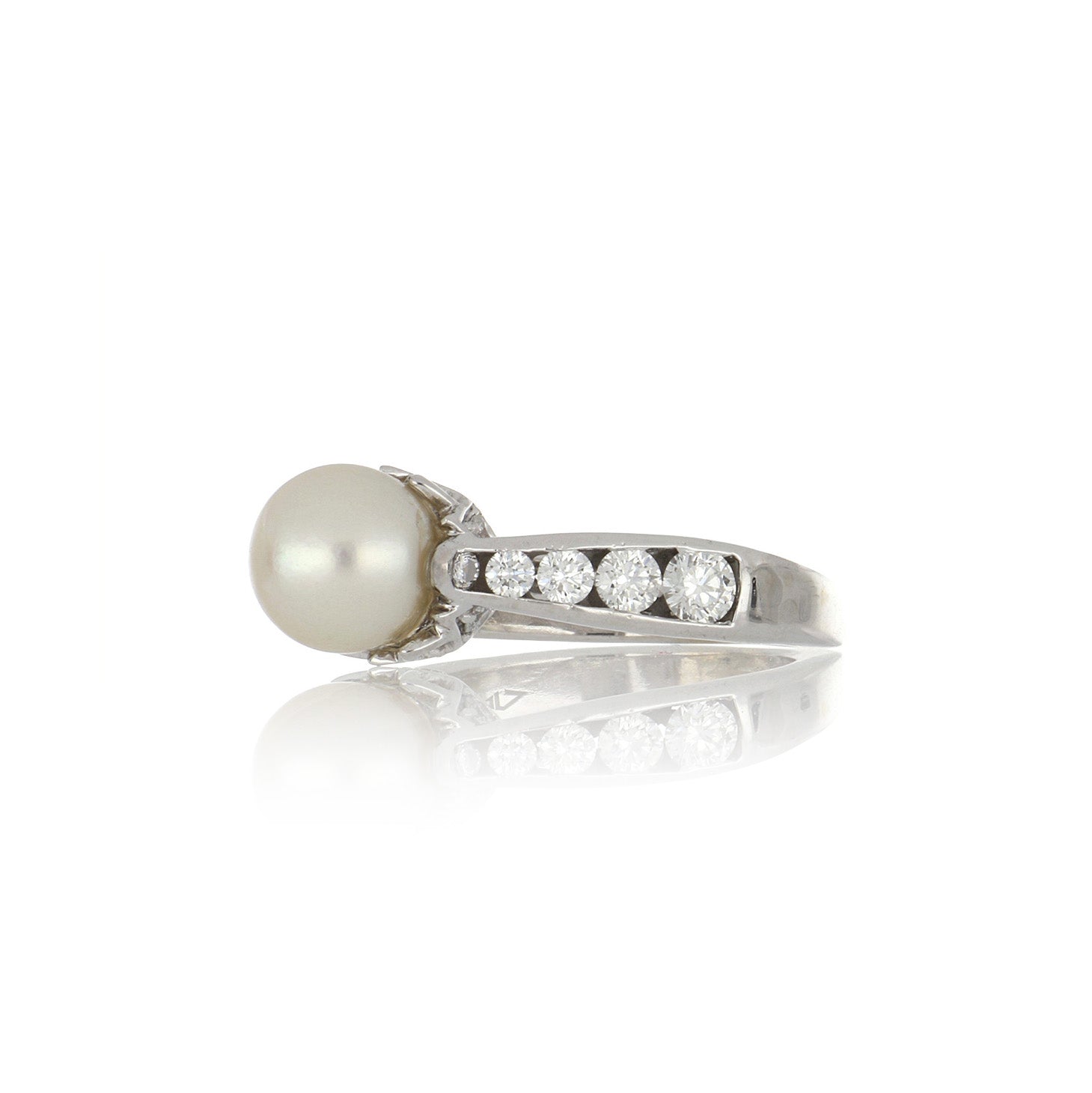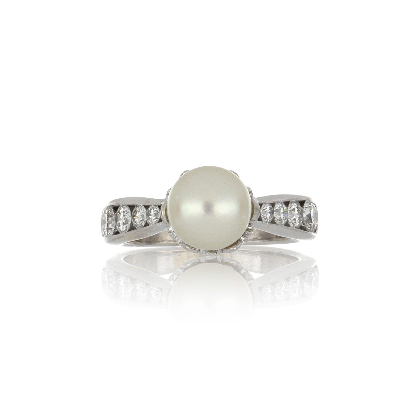 An estate Art Deco inspired Akoya pearl ring with channel-set round brilliant-cut diamonds, set in 18K white gold.