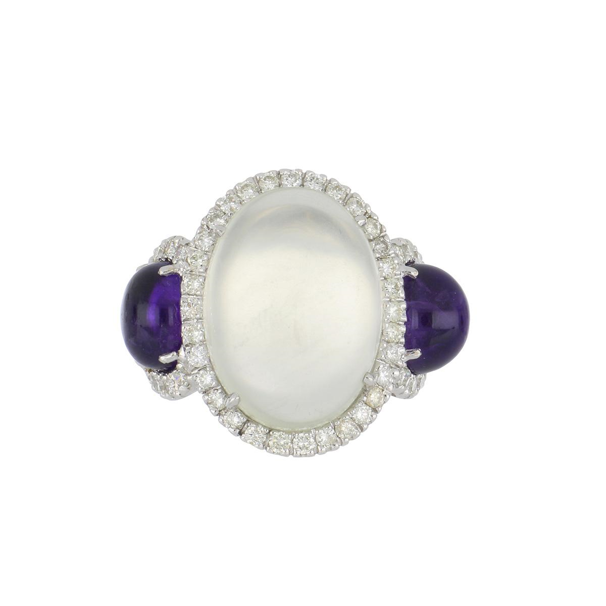 An estate oval  cabochon moonstone and amethyst three stone ring with diamond frame, set in 18K white gold. Circa 2000.1