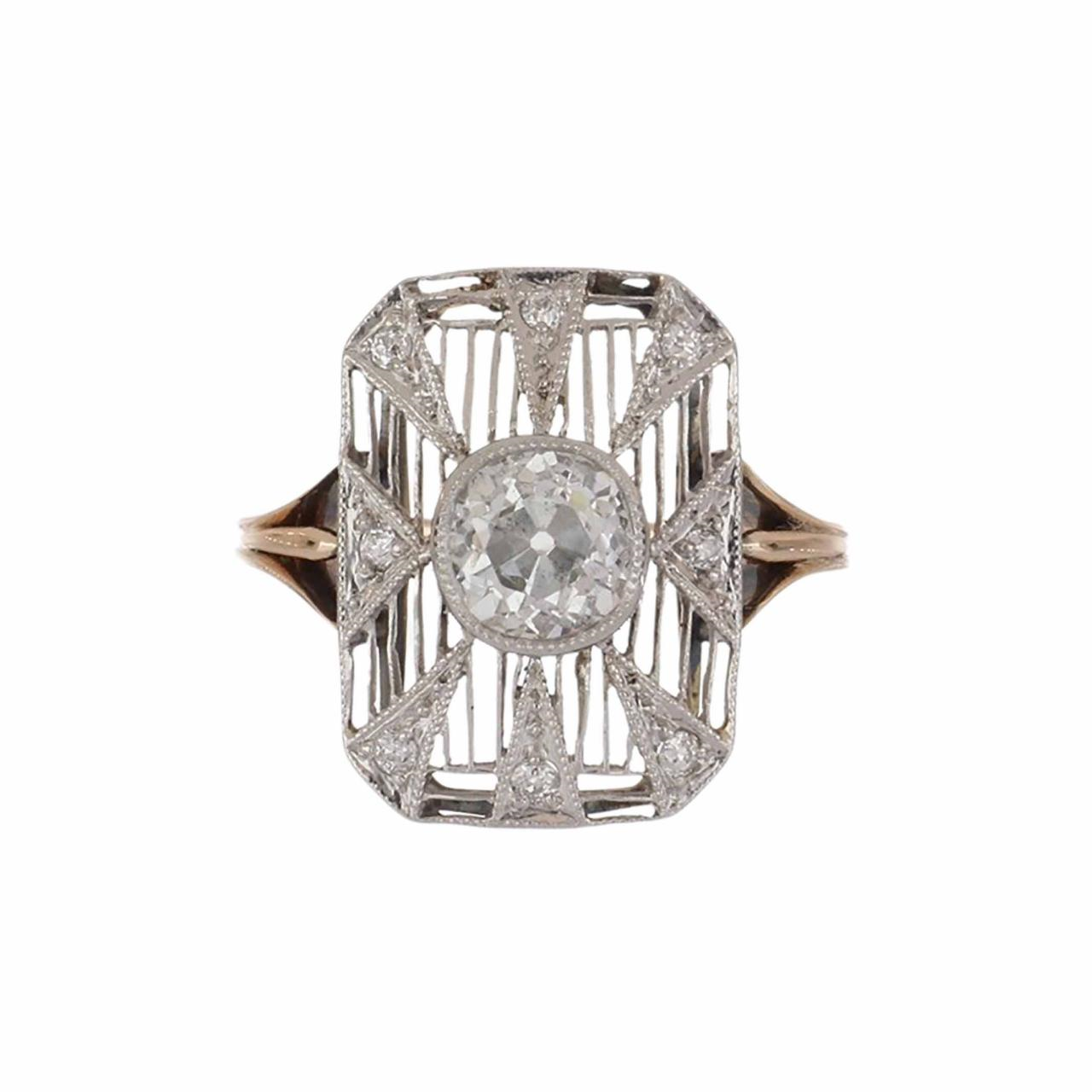 An Edwardian fretwork plaque ring with an old European-cut diamond center, set in platinum and 14K yellow gold. Circa 1910.