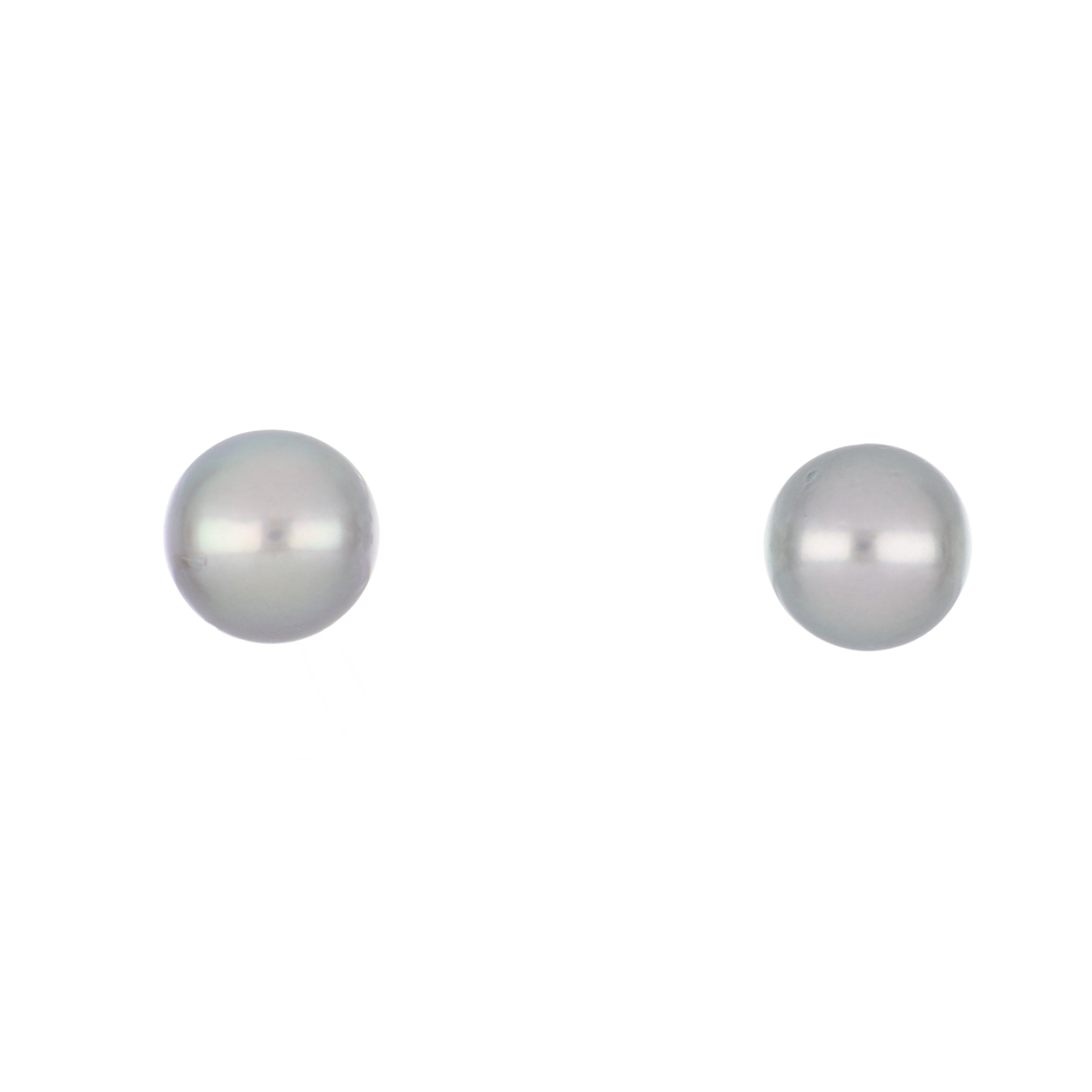 A pair of estate modern, round tahitian pearl stud earrings set in 14k white gold.