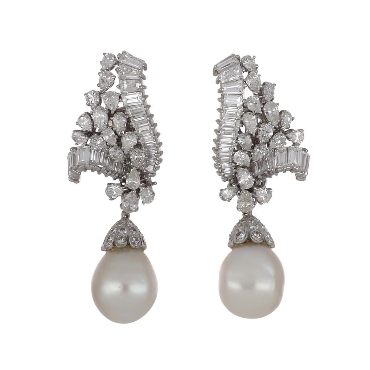 A pair of estate vintage Mid-Century day/night diamond cluster earrings with south sea pearl and diamond drops set in 14k white gold and platinum.