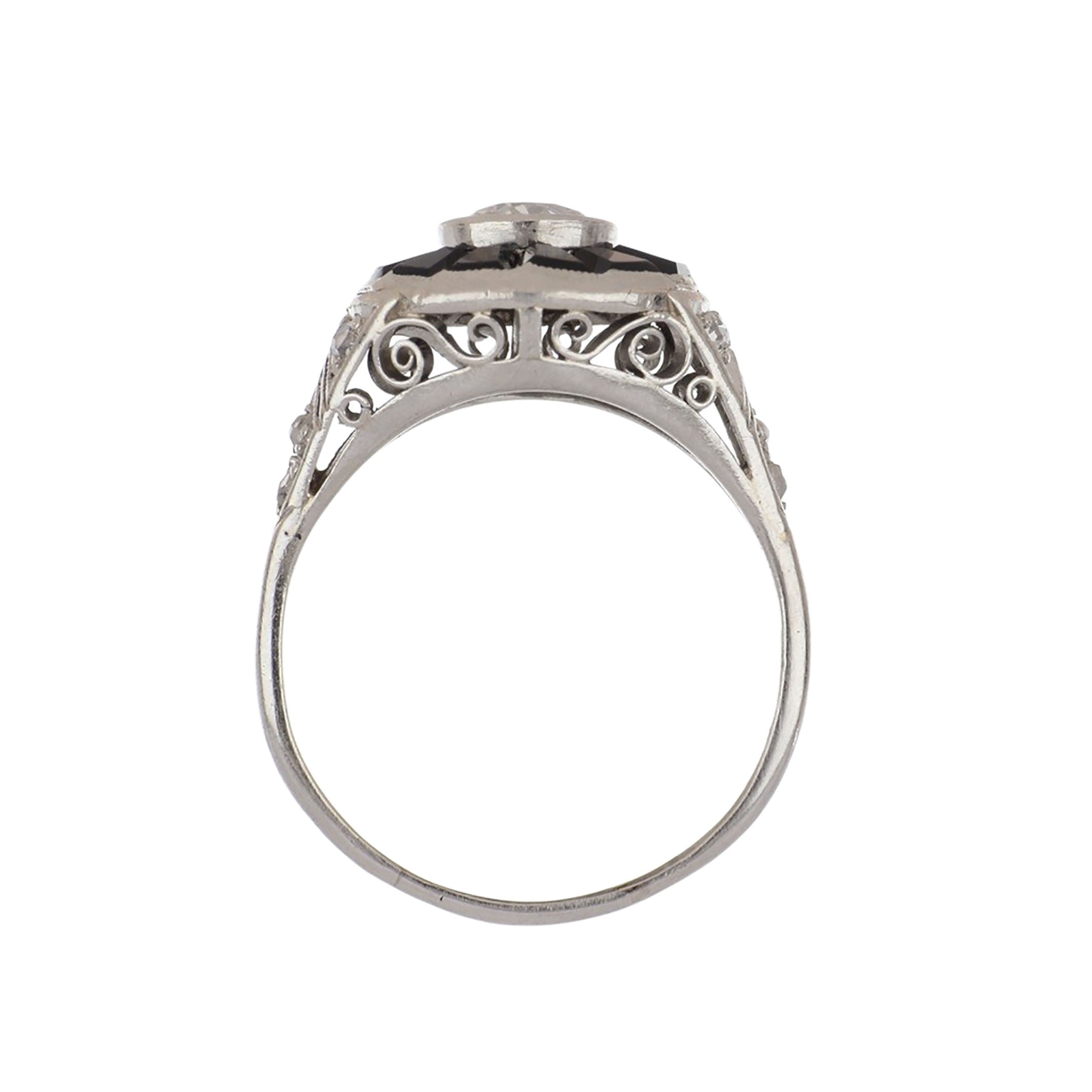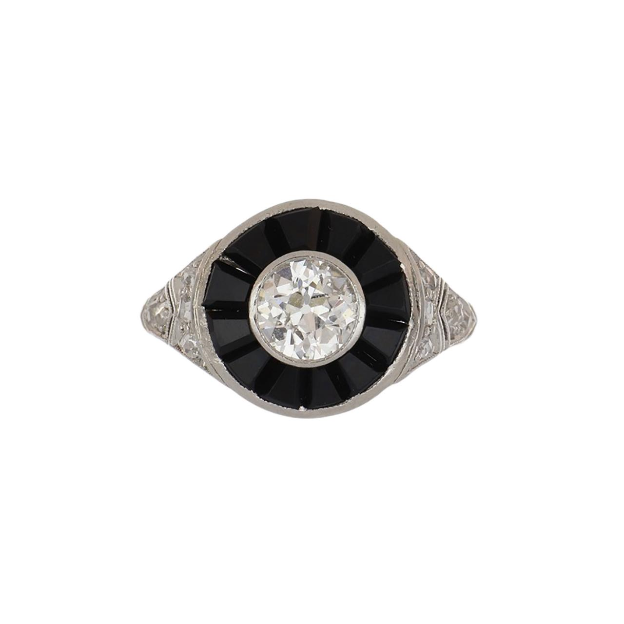 An Art Deco bezel-set old European-cut diamond target ring with calibré-cut onyx, openwork shoulders, and rose-cut diamond accents. Circa 1920.