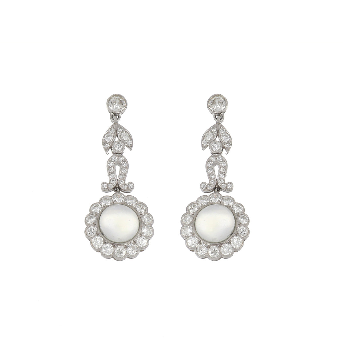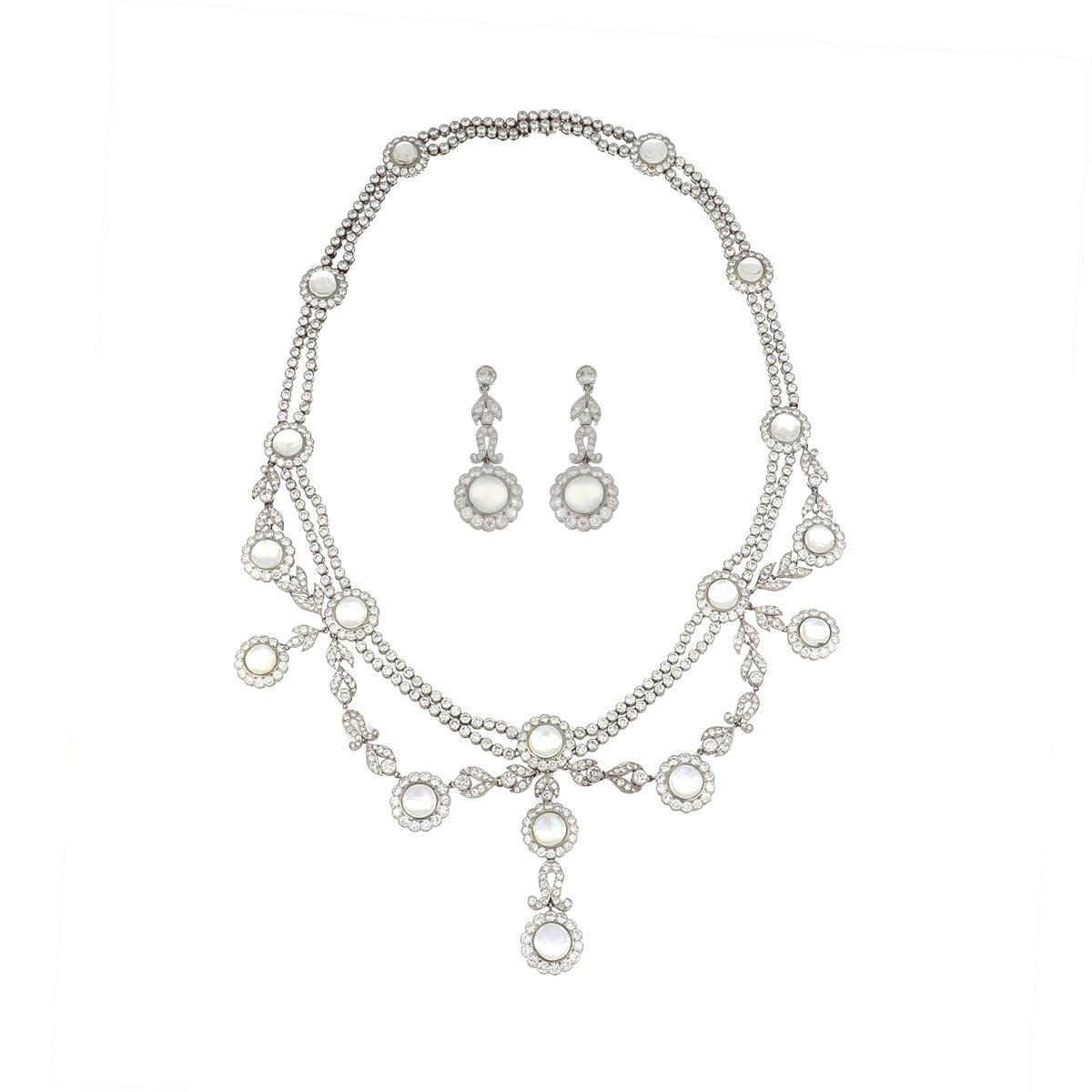 An estate Edwardian-style platinum moonstone and diamond festoon necklace with earrings. Circa 2010. The necklace features doubled strands of collet-set diamonds with moonstone and diamond junctions with a third bead-set diamond strand in a garland design.