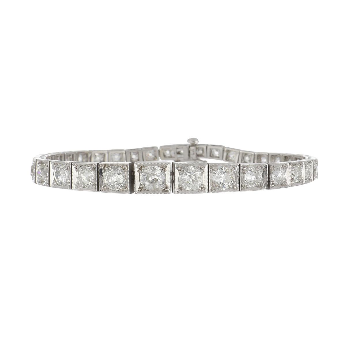An estate antique classic Edwardian, box link, graduated old european-cut diamond line bracelet in platinum with chenier.