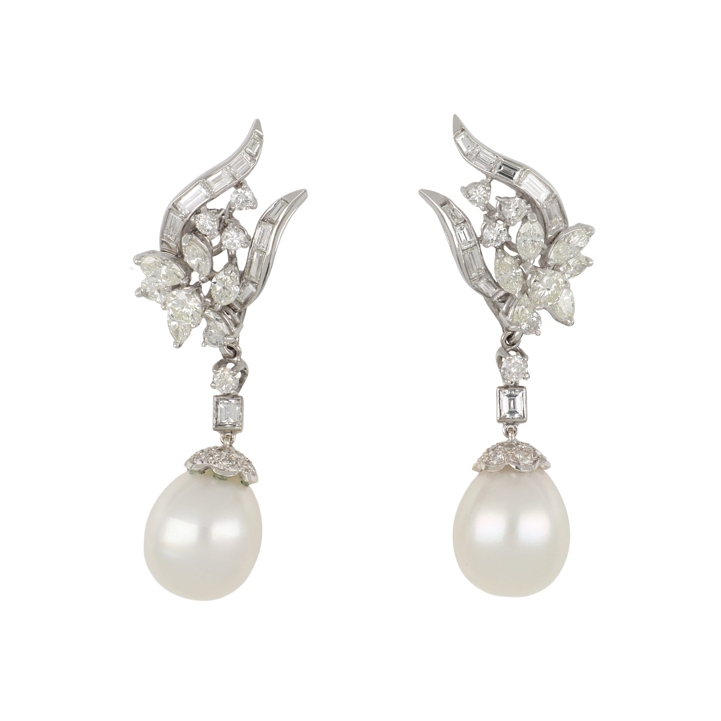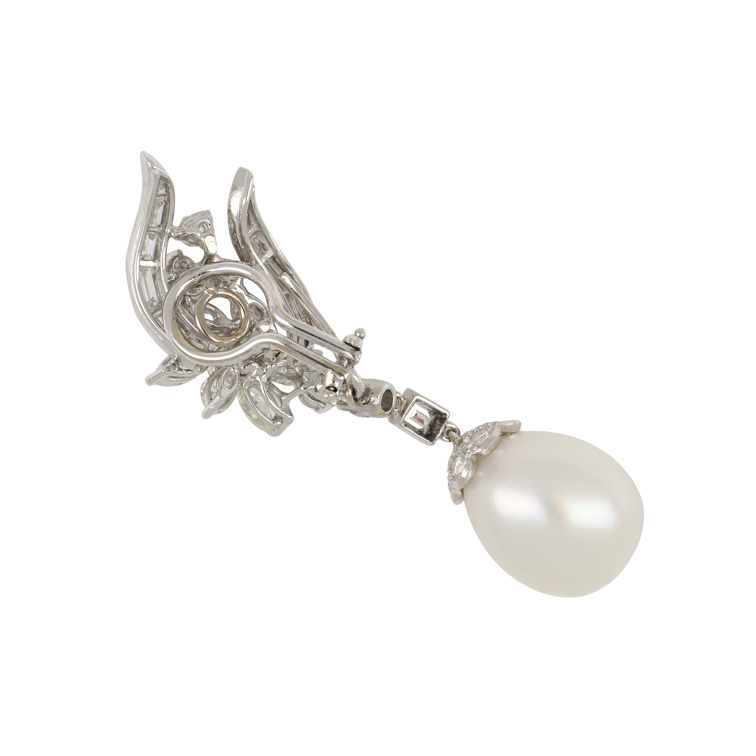 An estate vintage pair of pearl and diamond day/night drop earrings, set in platinum.